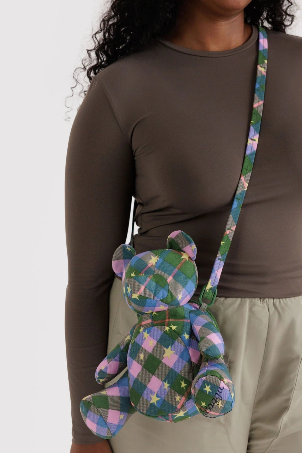 Your emotional support Bear Bag. A removable strap lets you wear this teddy-shaped style as a crossbody. Stuffed head, arms, and legs to hold its shape, back zip compartment to hold your things. By Baggu.