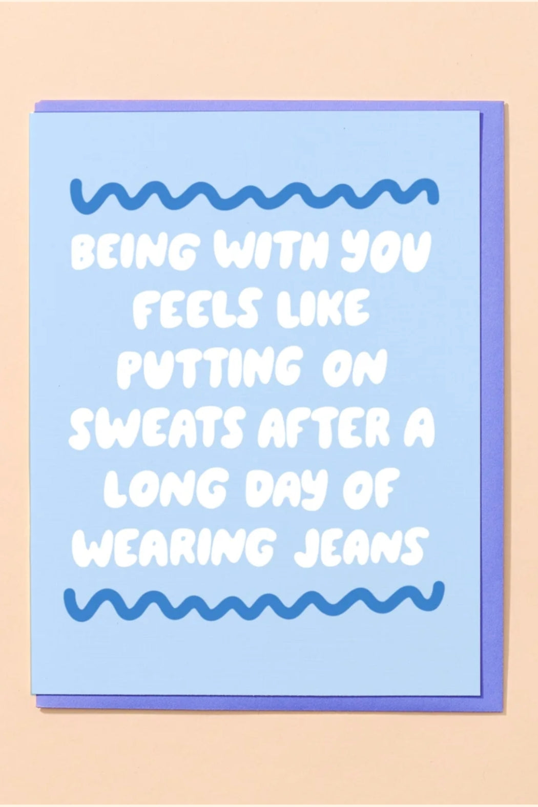 Card reads, “Being with you feels like putting on sweats after a long day of wearing jeans”