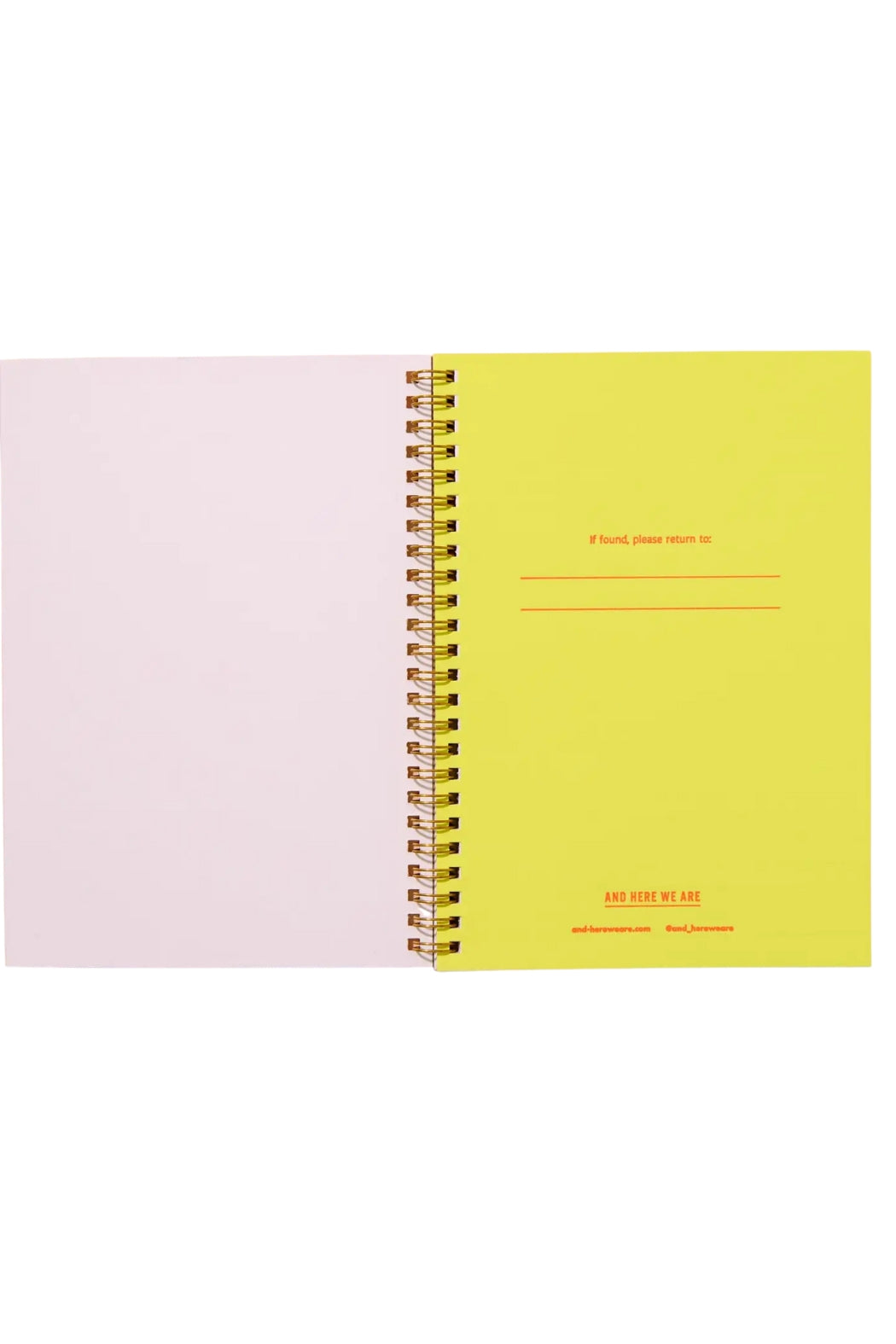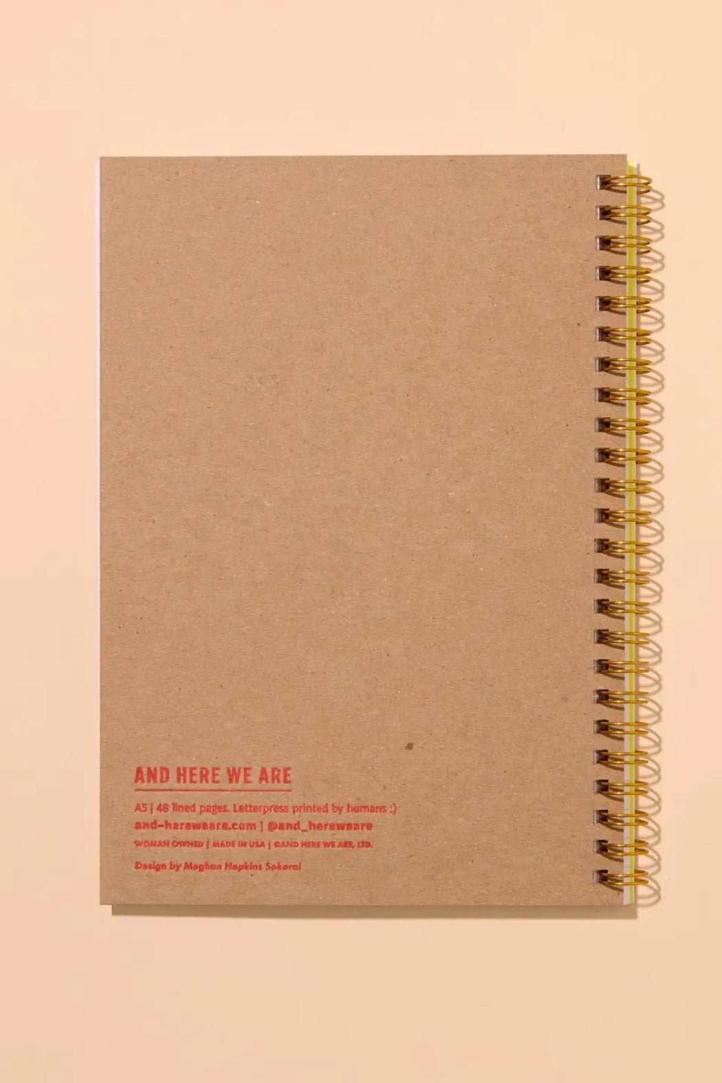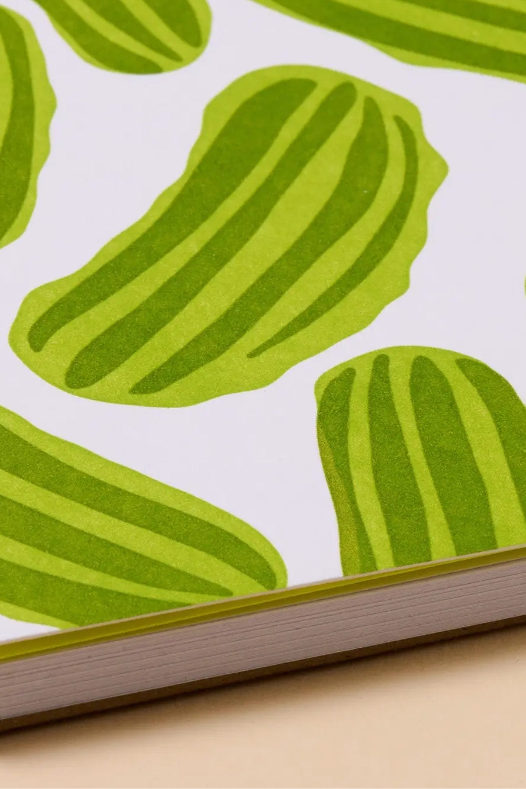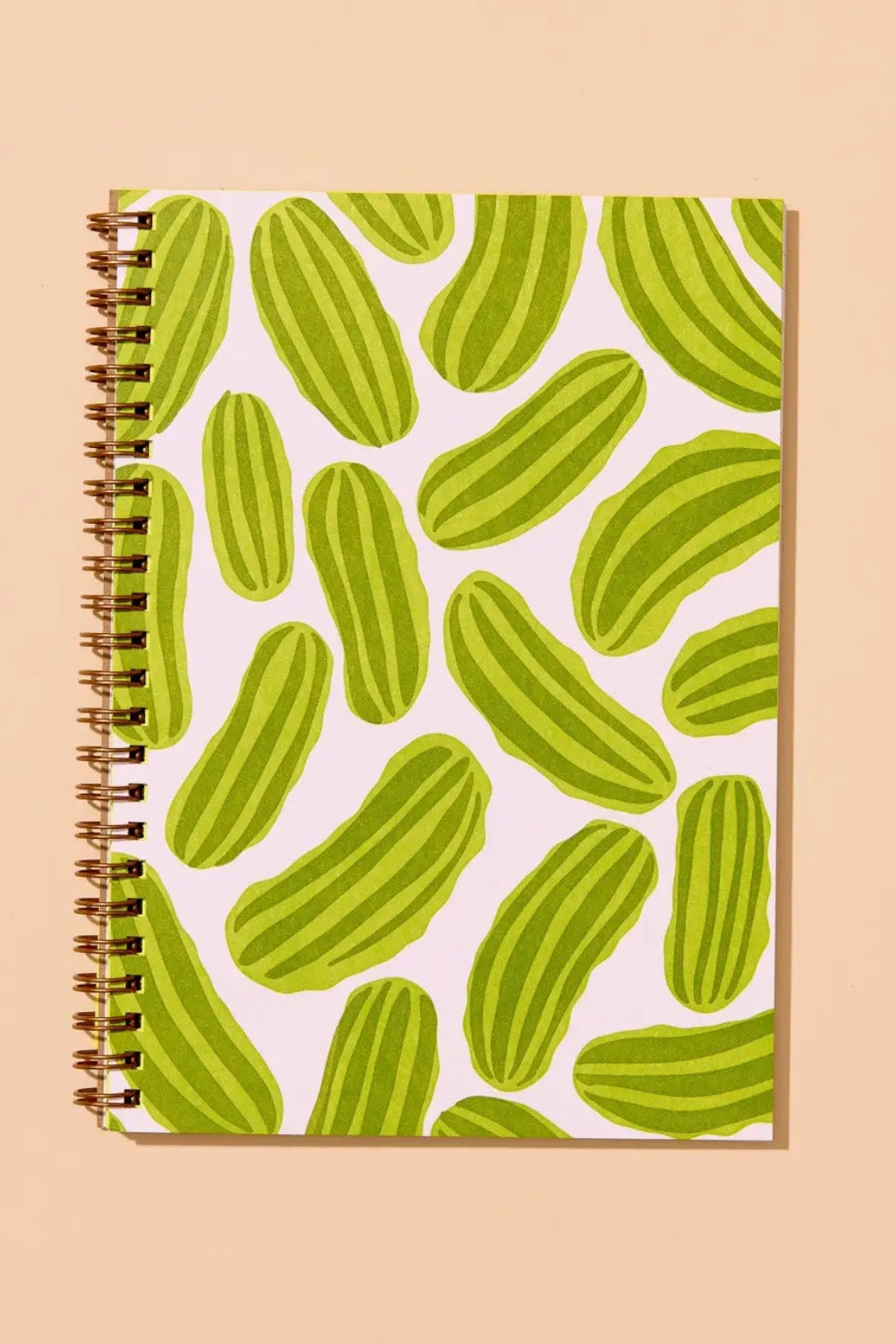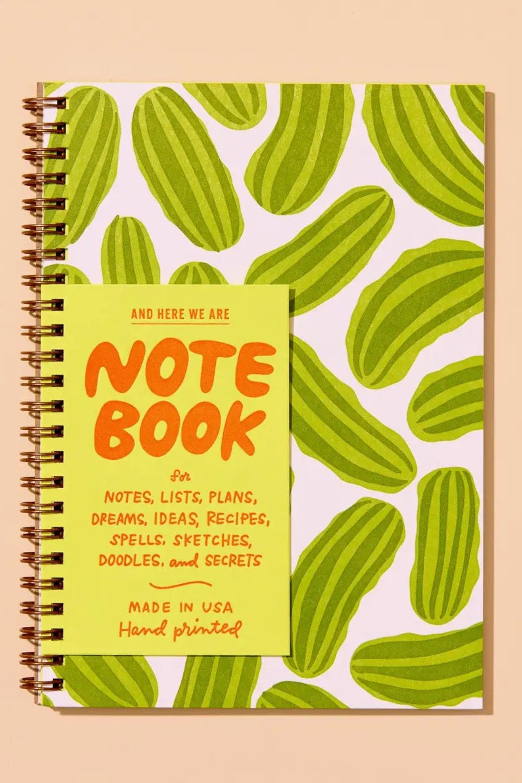 A best-selling letterpress A5 spiral-bound notebook with a colorful and modern pickle pattern (dreams DO come true!) in vibrant green inks. Perfect for everyday notes, lists, or as a gift! By And Here We Are.