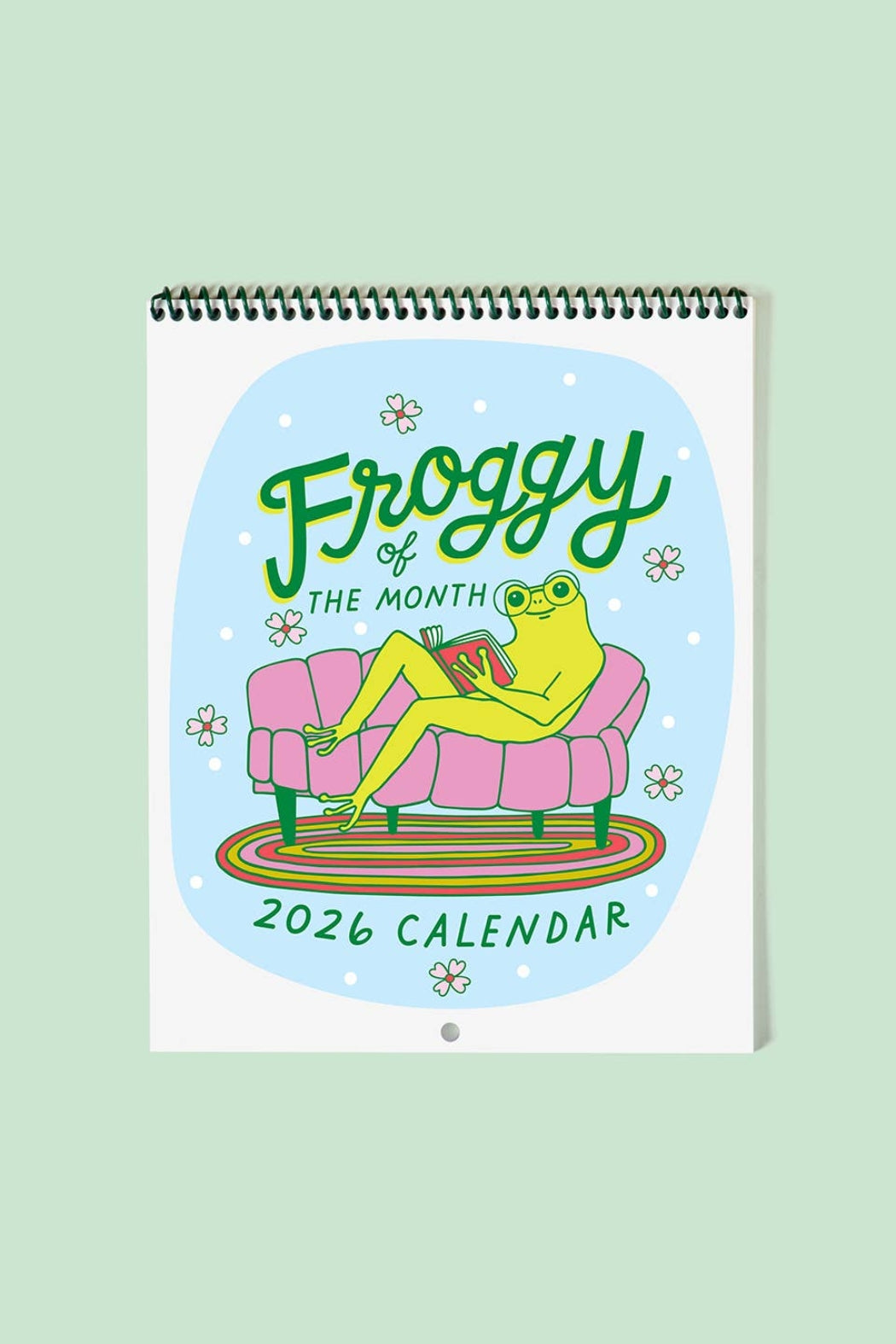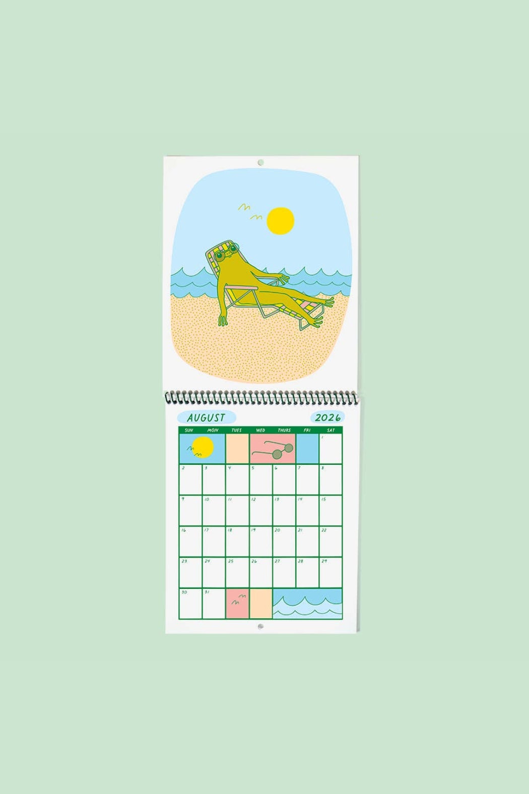 A colorful 12 month calendar showcasing happy froggies in various entertaining scenarios and happy forest friends! This calendar is 8 x 10 inches (8 x 20 hanging), flat printed, and coil bound with drilled hole for wall hanging.