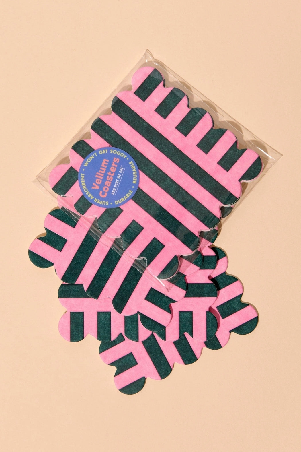 Vellum Coasters - Set of 4 Scalloped Stripe Pink + Green