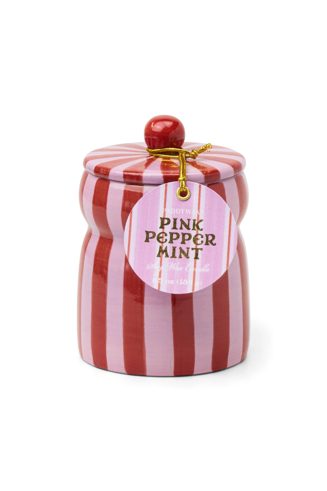 Bright and cheerful, the Pink Peppermint ceramic candle adds a playful touch to the holiday season. Presented in a hand-painted striped vessel of red and pink with a matching lid, this candle features the cool, sweet fragrance of peppermint candy. Once the candle has burned, the ceramic jar can be reused as a decorative storage piece or holiday keepsake.