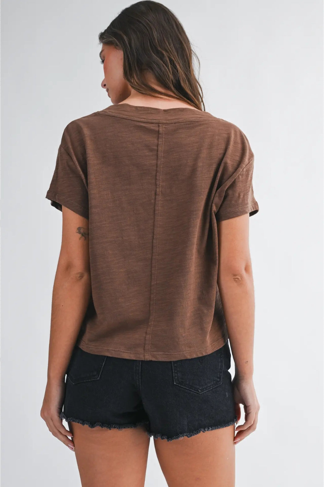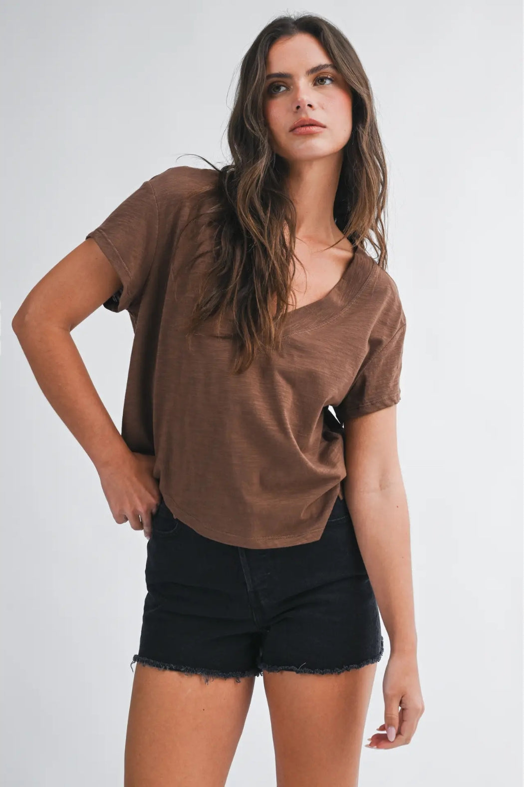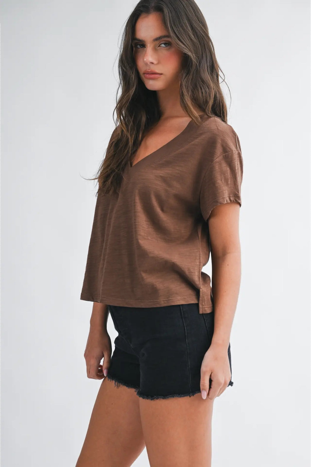 Elevate your wardrobe with this trendy v-neck baby tee designed with a slight boxy cropped fit and short sleeves for a fresh and stylish look.