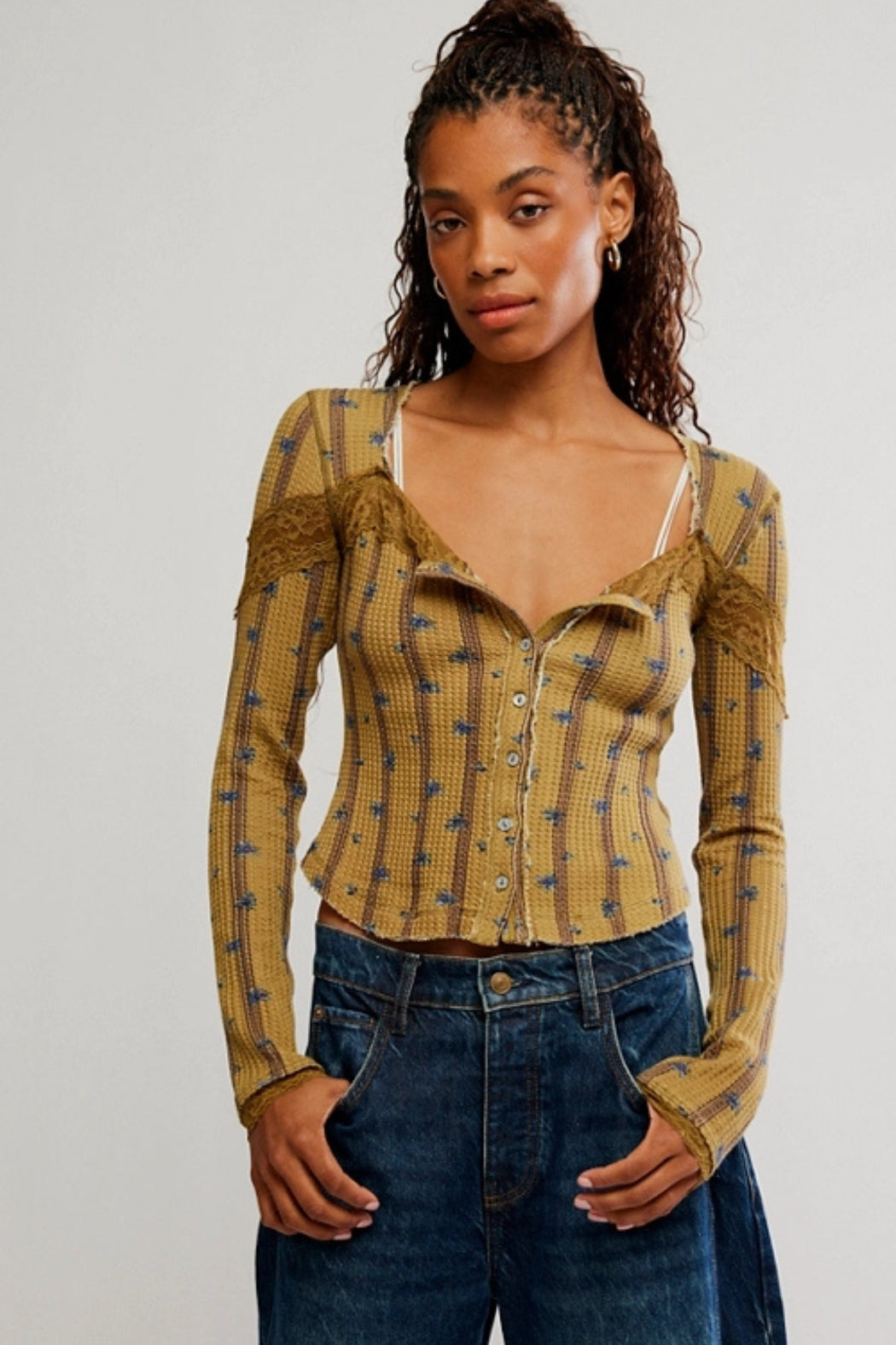 You’re the life of the party in this cardi by Free People , featured in a classic button-front style with lace details for the perfect funky touch. It takes a sophisticated style and gives it a daring touch.