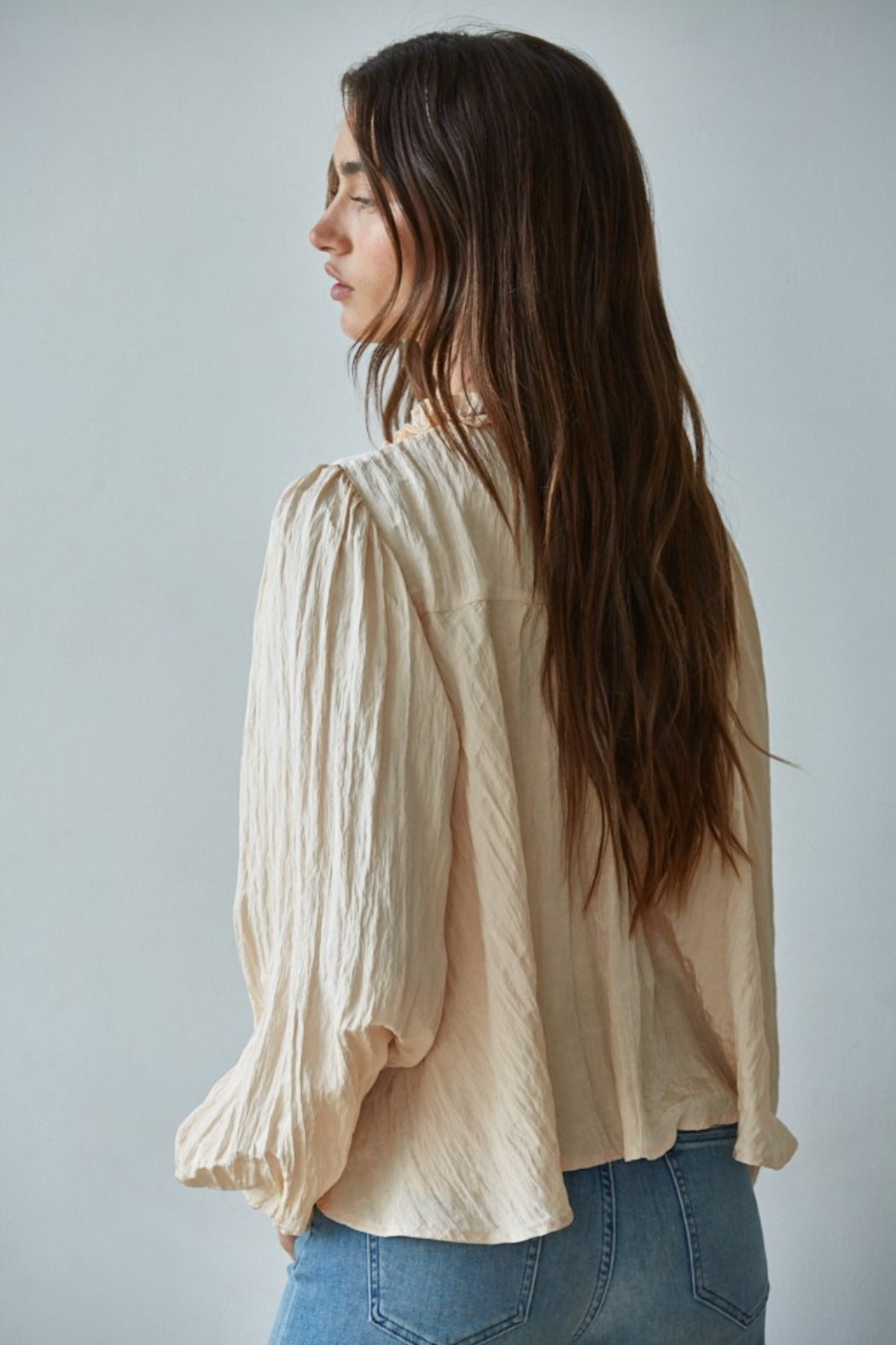 The Natalie Blouse is a beautiful vintage-inspired long sleeve top with sheer lace detailing across the center torso and a ruffled peplum.