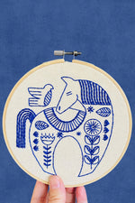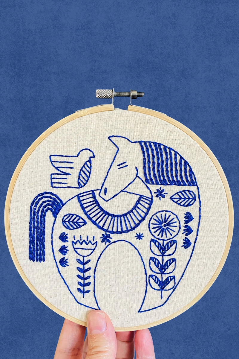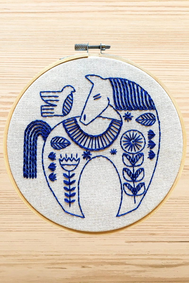 Hook, Line, and Tinker's Hygge Horse pattern has beautiful blue embroidery floss and is designed in their signature modern Scandi-inspired folk style.