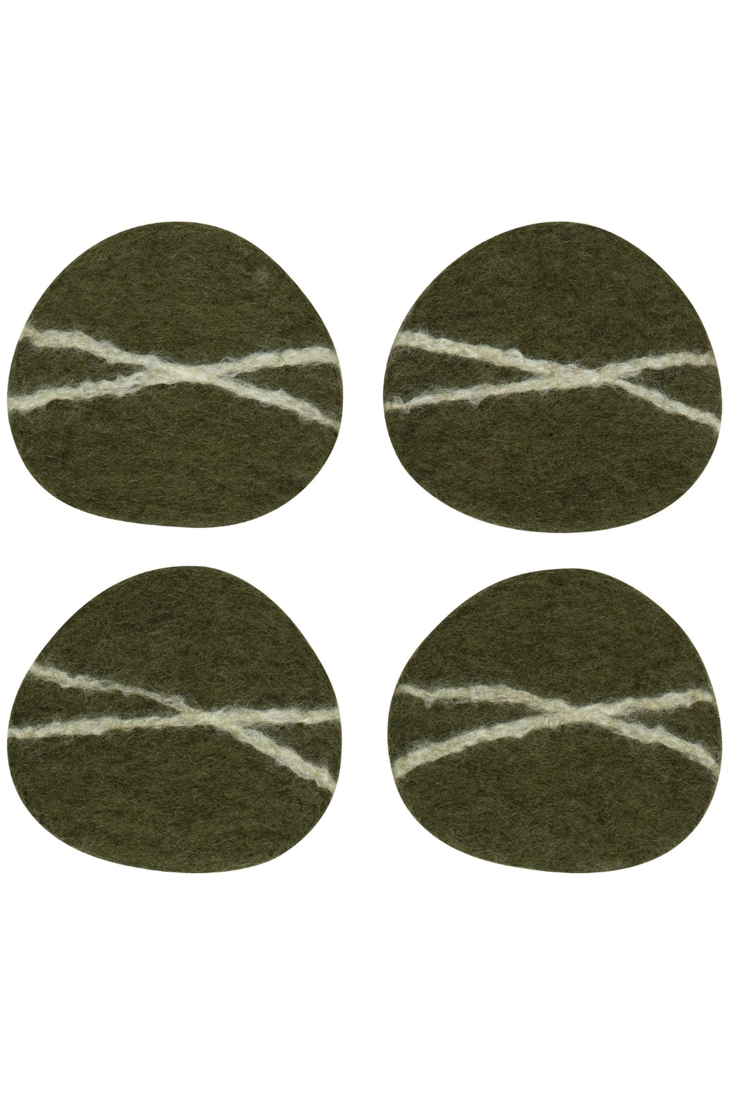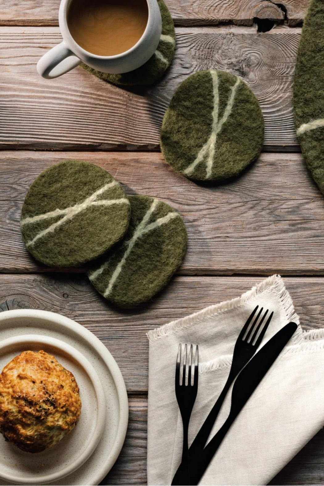 Luxuriously soft, the felted wool Olive Branch Striato placemat enhances both holiday and everyday dining. Inspired by the organic shapes and patterns of pebbles, each placemat is handmade in Nepal.