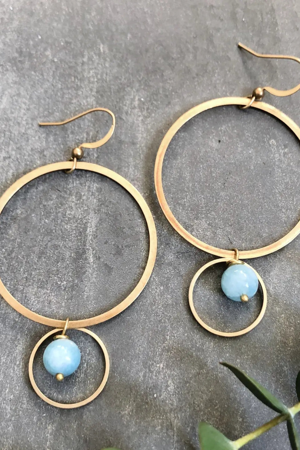 Handmade earrings by GeoMetricGem using brass and natural Aquamarine beads. Measure approx. 2-3/4"L x 1.5"W.