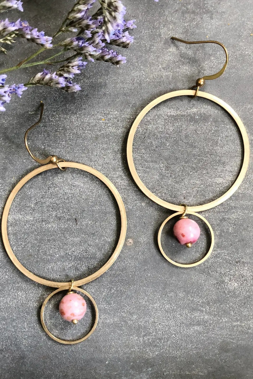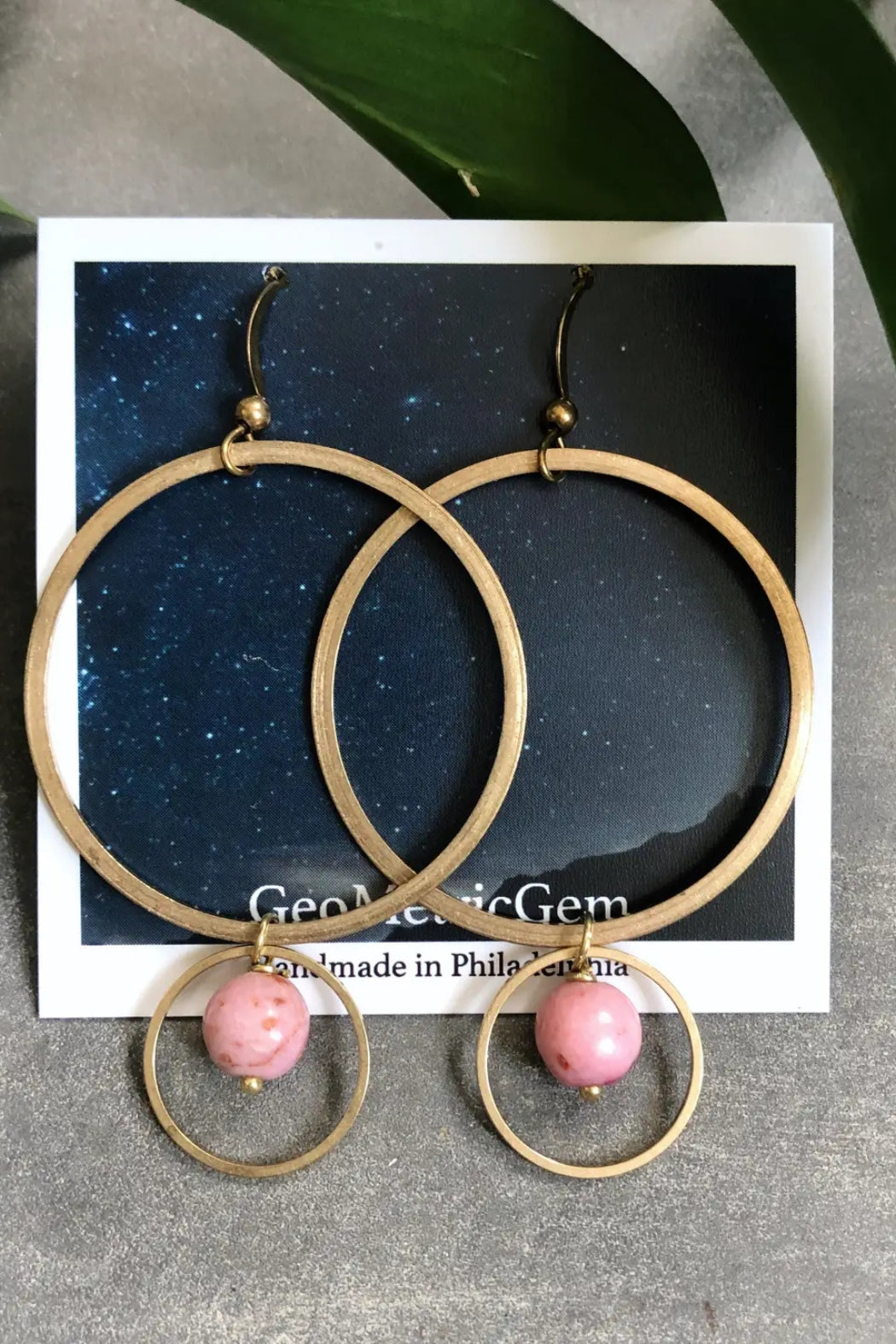 Handmade earrings by GeoMetricGem using brass and natural Rhodonite beads. Measure approx. 2-3/4"L x 1.5"W.
