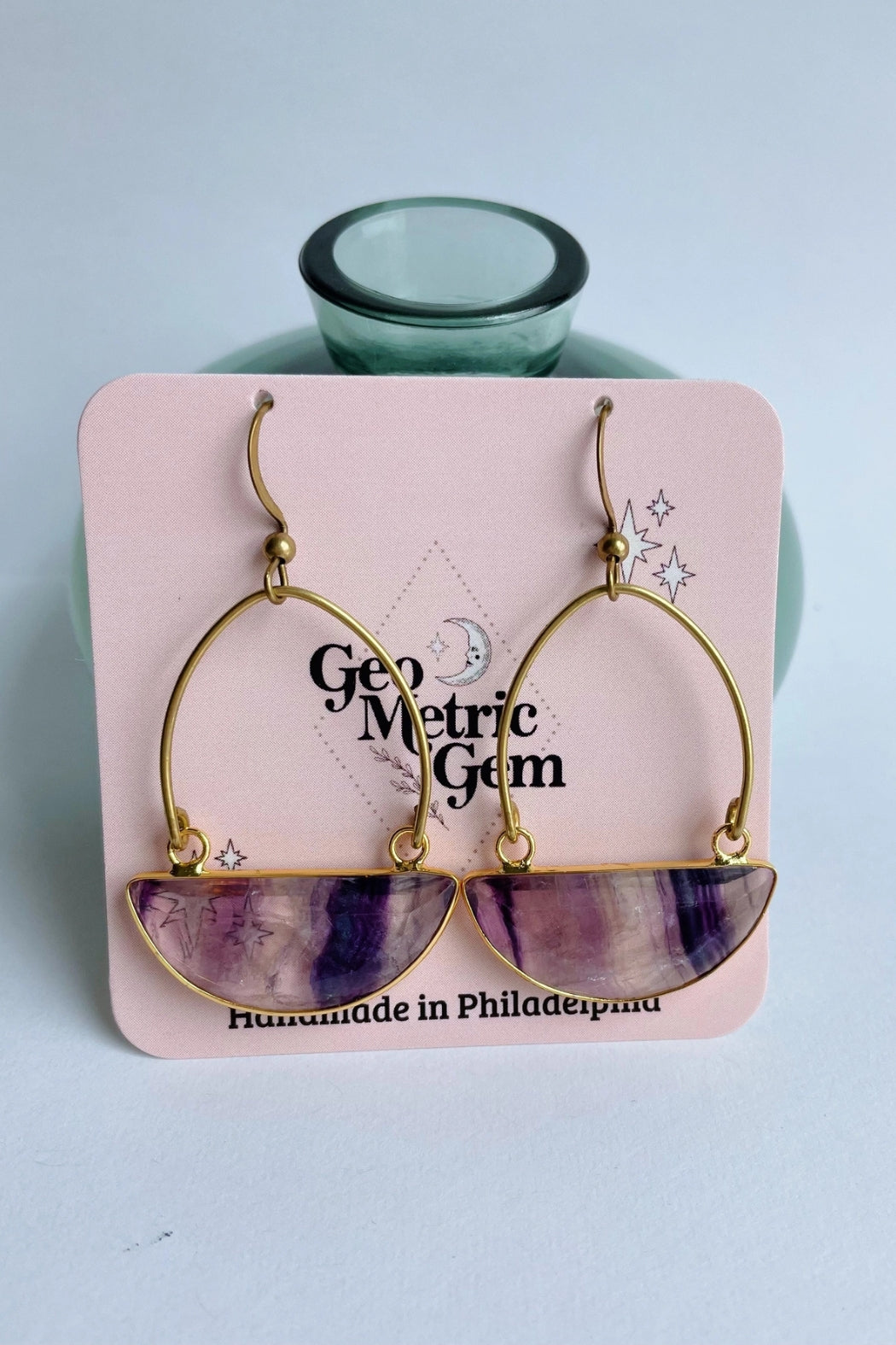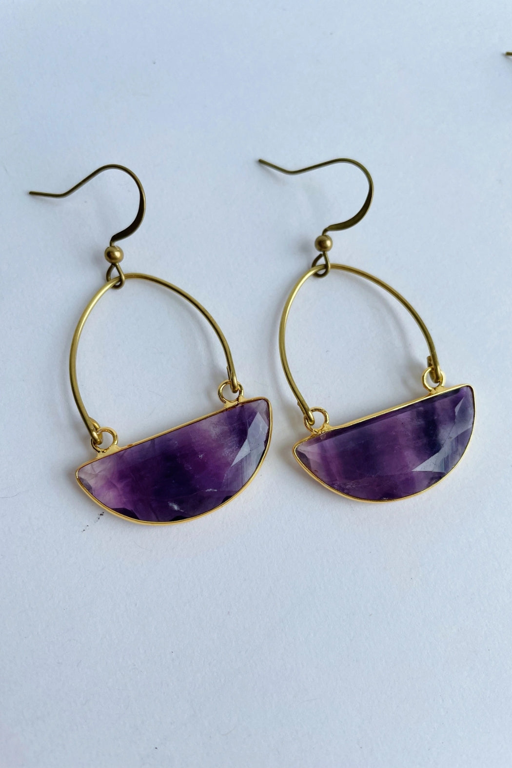 Handmade earrings by GeoMetricGem using Fluorite Gemstones, Brass, Gold Plating and Brass Ear Wires ( Hypo Allergenic ). Each Pair of earrings slightly varies in color since all stones are natural and no two are exactly alike. Measure approx. 2.25"L x 1.25"W