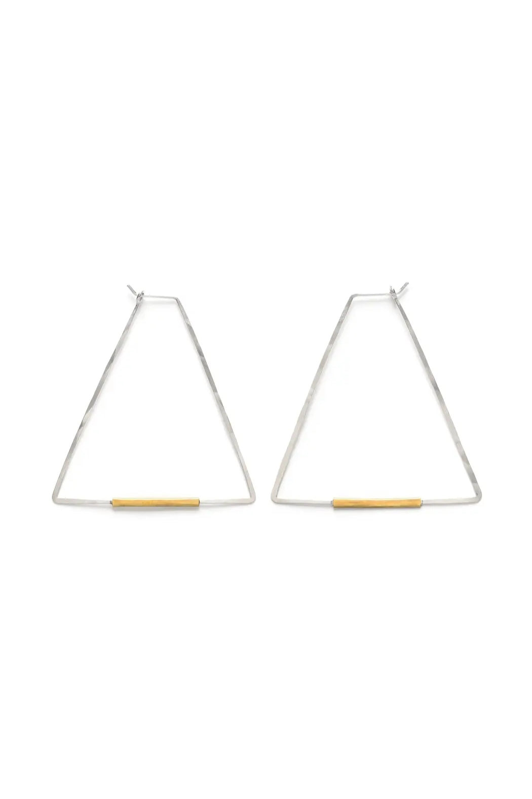 Handcrafted Triangle Hoops in Mixed Metals. 1.75” x 2”. Sterling Silver and Brass. Made in United States.
