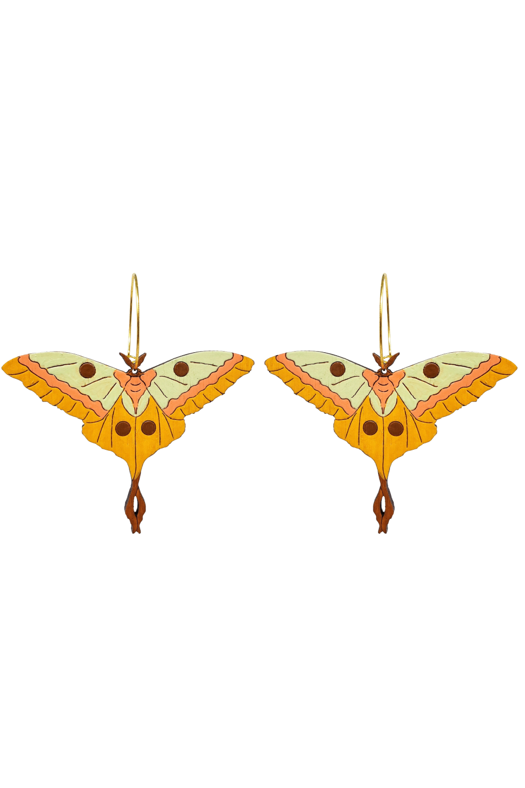 Wooden moth hoop earrings with colors reminiscent of the 70's.