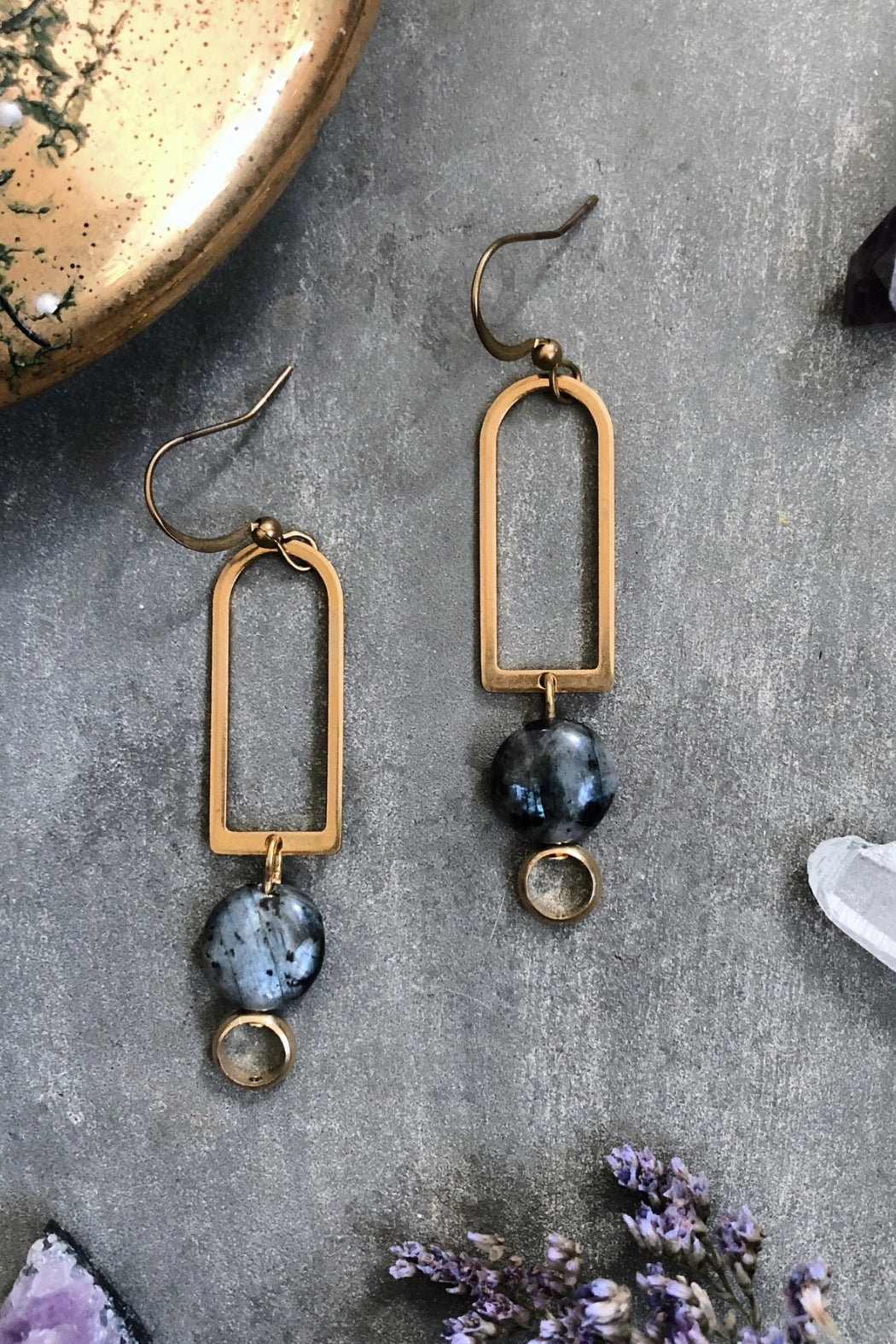 The Manjo Earrings by GeoMetricGem are handmade using Brass and Natural Labradorite.