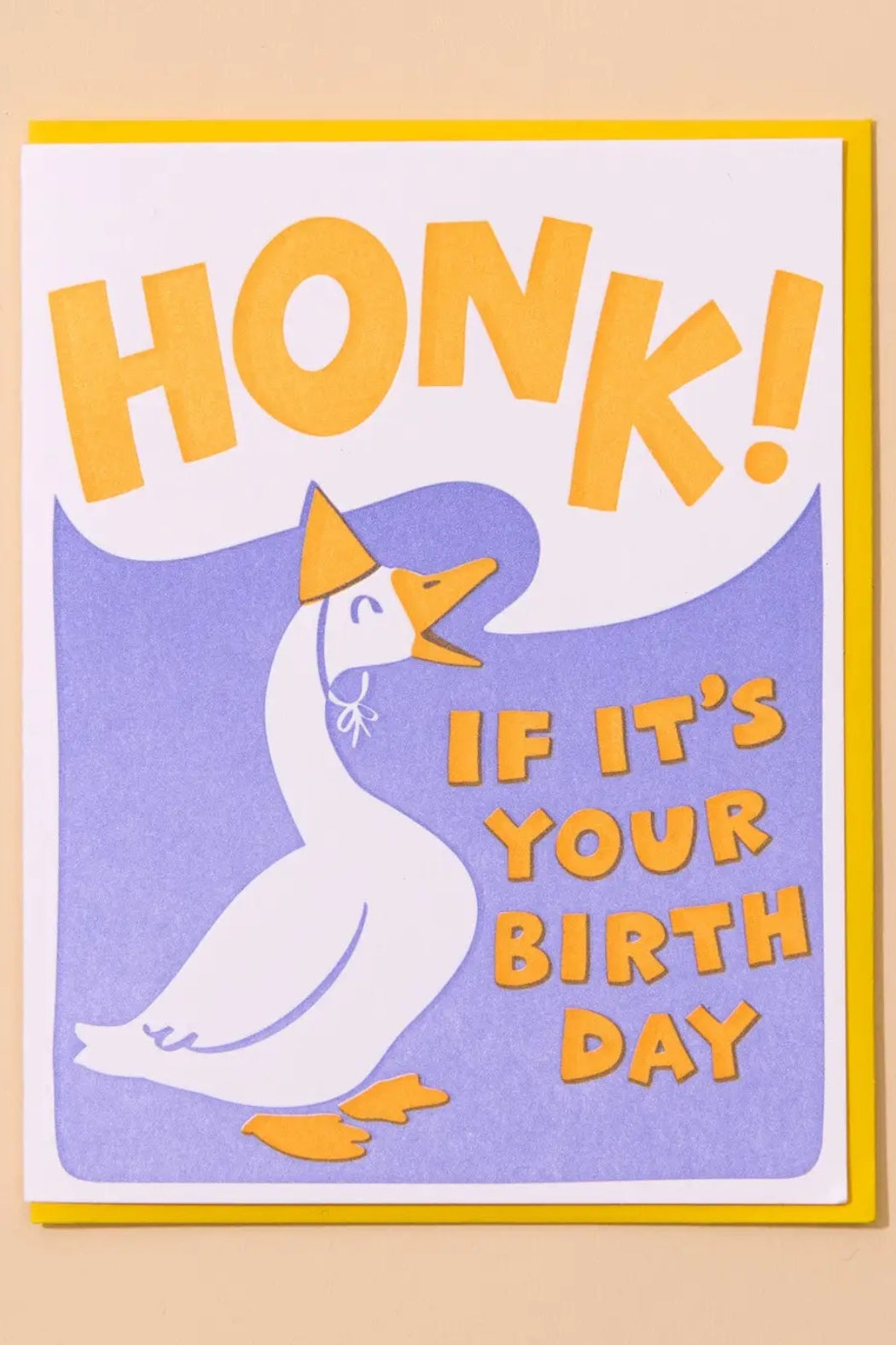 Colorful, fun letterpress birthday greeting card reading “HONK if it’s your birthday,” featuring a silly goose in a birthday hat.