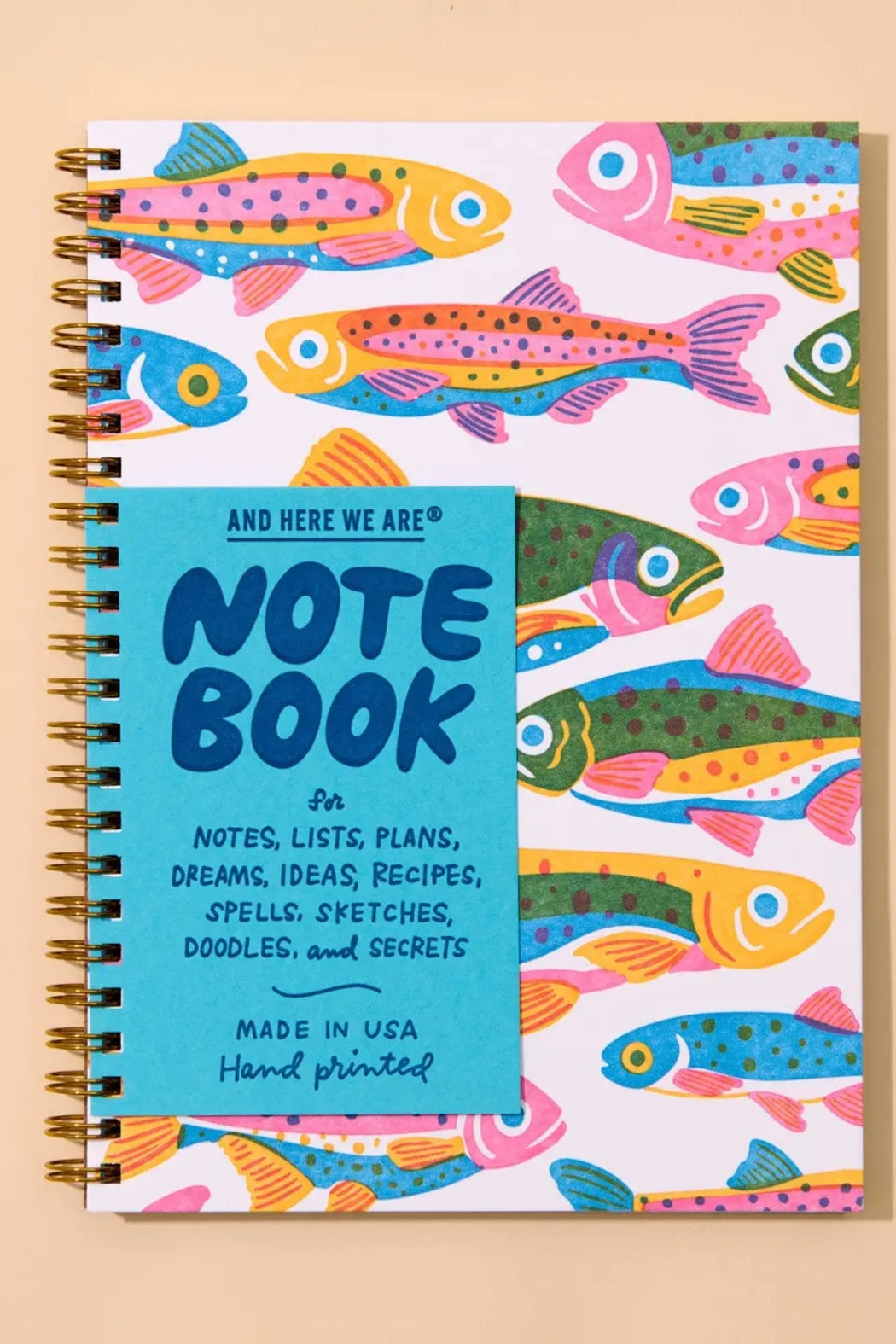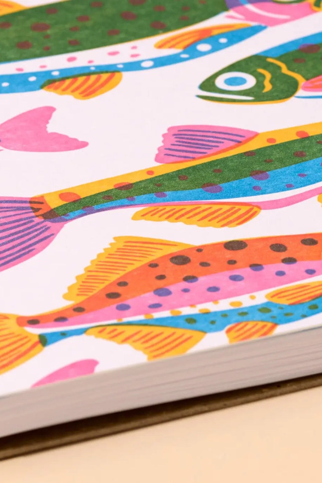 A best-selling letterpress A5 spiral-bound notebook featuring a colorful rainbow trout pattern. Perfect for everyday notes, lists, or as a gift! By And Here We Are.