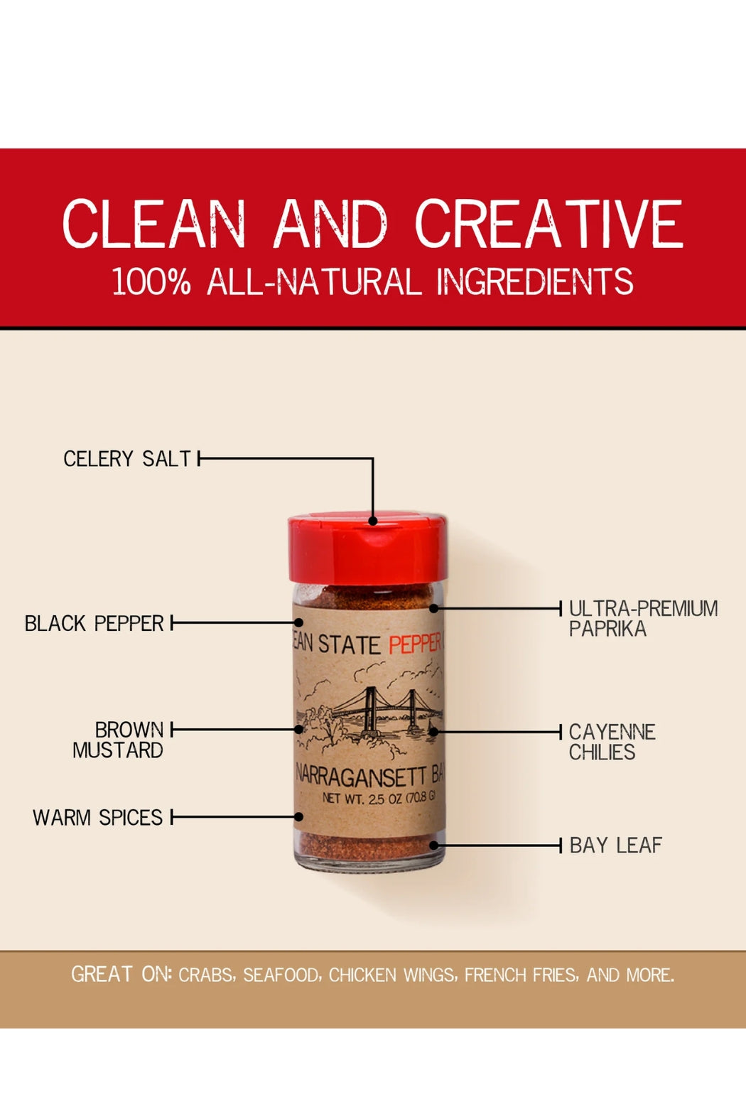 Ocean State Pepper Co.'s take on a classic, with a wicked accent. A kick of freshly blended cayenne peppers along with celery salt, and aromatic spices like nutmeg, allspice, ginger, and cloves, gives you everything to take on your next culinary adventure.
