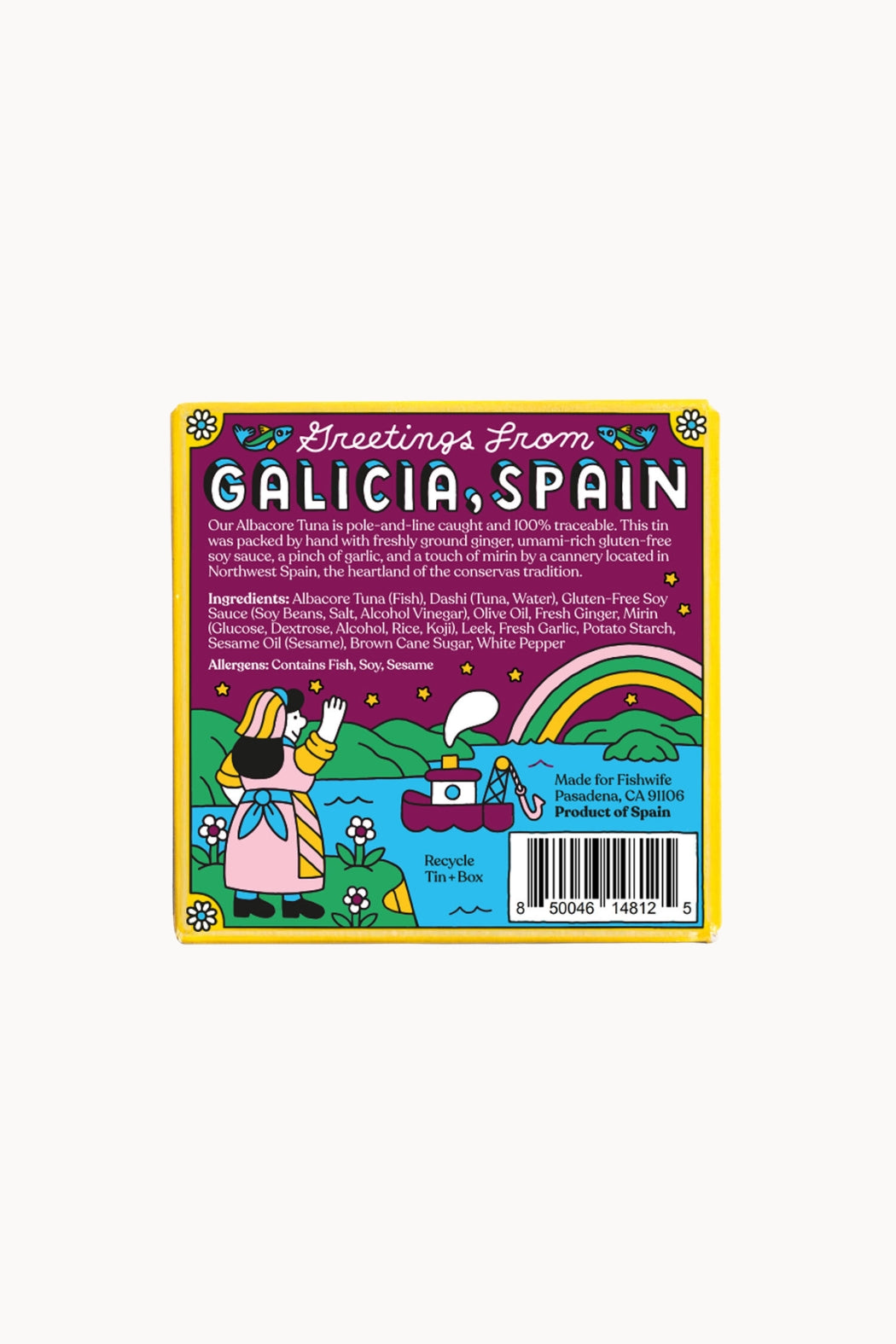 Fishwife's albacore tuna is pole-and-line caught in the Bay of Biscay and off the coast of South Africa by small boat fishermen. This tin was packed by hand with freshly ground ginger, umami-rich gluten-free soy sauce, a pinch of garlic, a splash of rice vinegar, and a touch of mirin by a cannery located in Northwest Spain, the heartland of the conservas tradition.