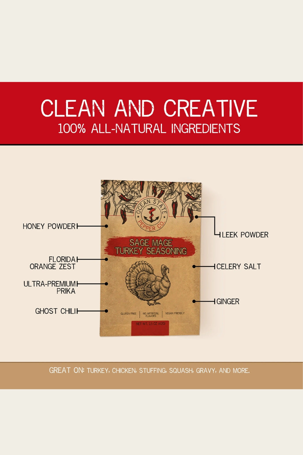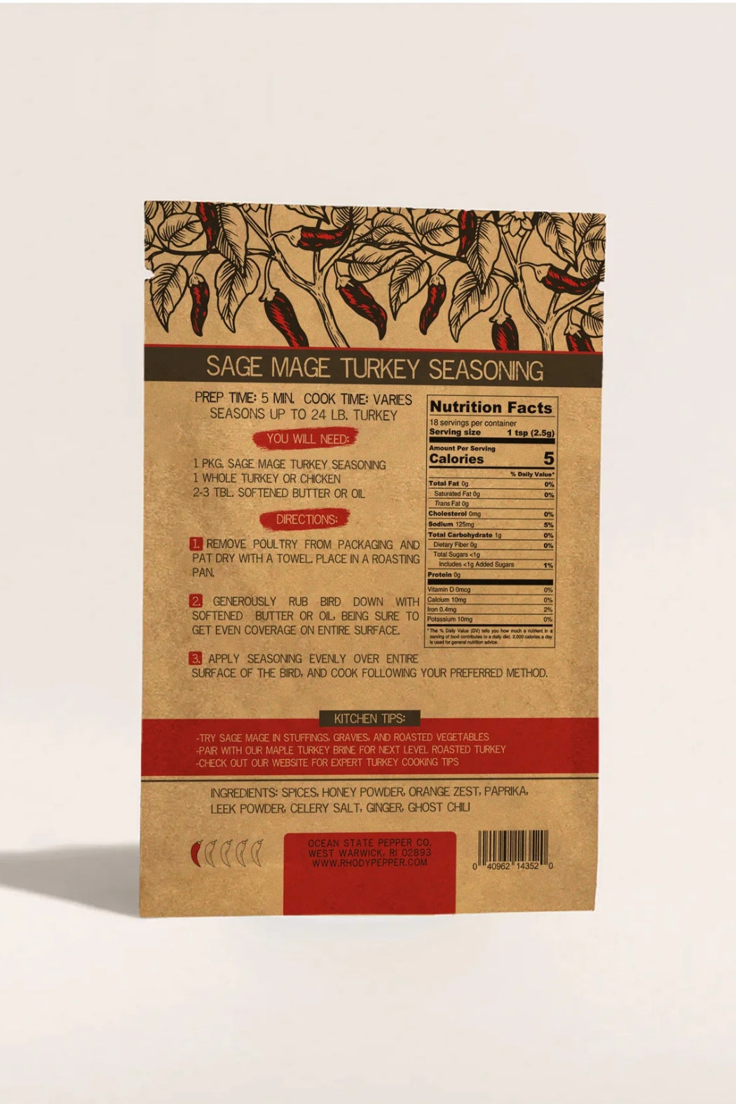 Consider your holiday turkey officially upgraded. Sage Mage is our spellbinding blend crafted to bring out the best in your bird. Classic fall herbs—sage, rosemary, and thyme—team up with savory accents of powdered leeks, celery salt, ginger, orange peel, and a touch of powdered honey. The result? A perfectly balanced mix that delivers golden, aromatic, juicy turkey every single time.