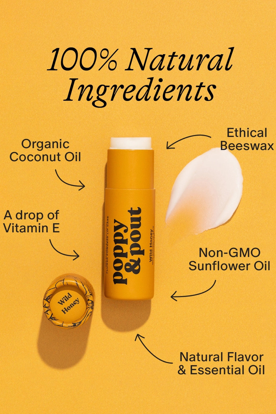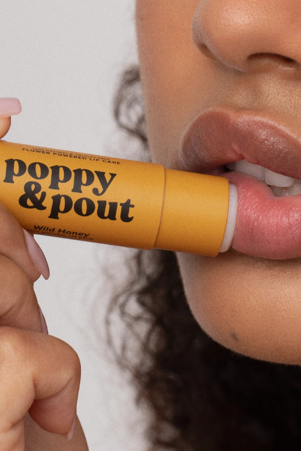 Poppy & Pout's Wild Honey Lip Balm is a soft and savory vibe for your lips! It’s subtle, sweet, and will hydrate your lips for hours. Every Poppy & Pout lip balm is made with 100% natural ingredients and hand-poured into eco-friendly cardboard tubes!