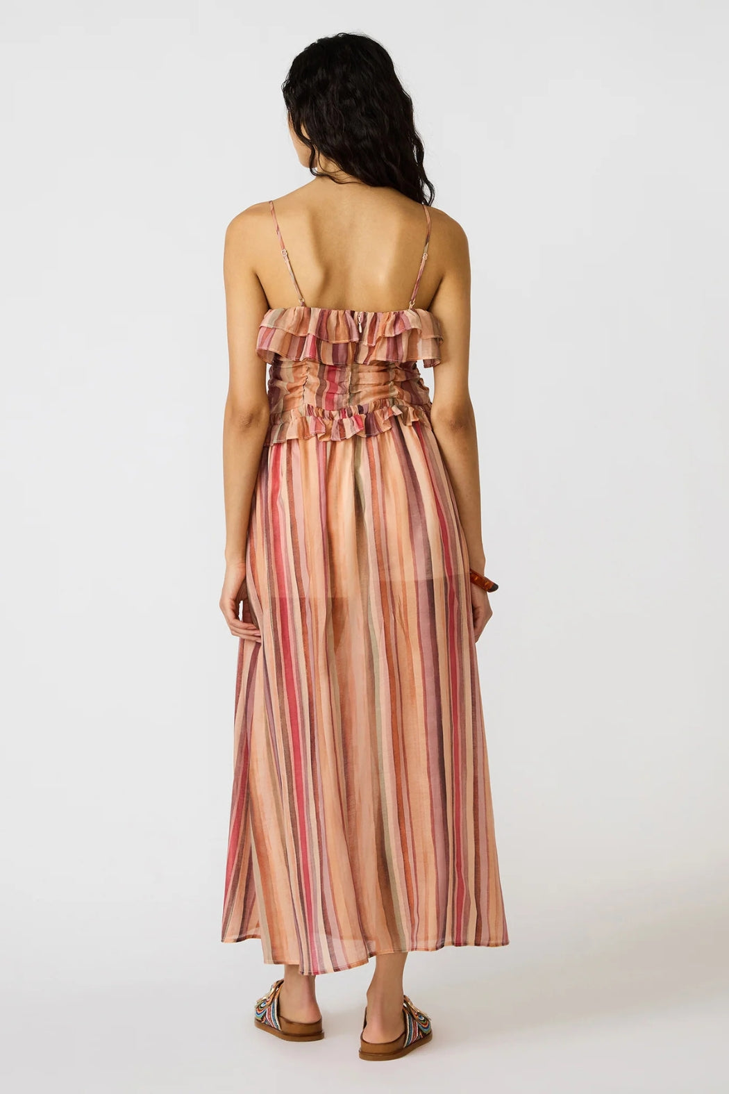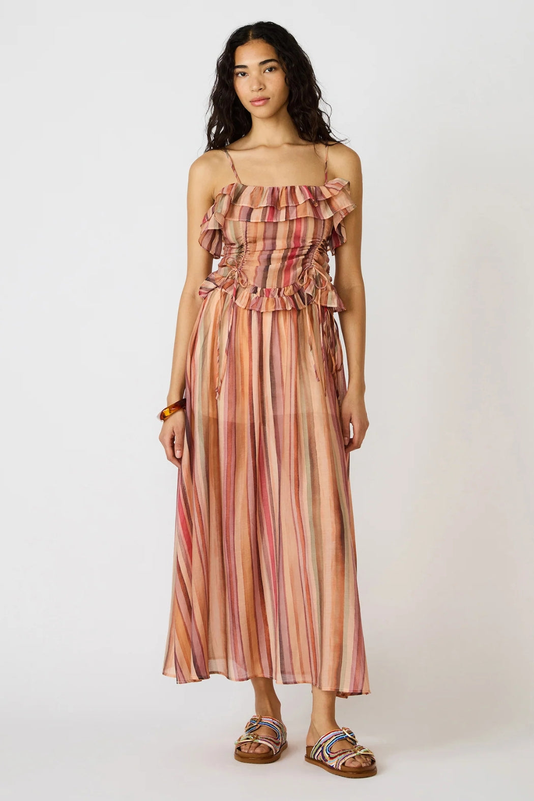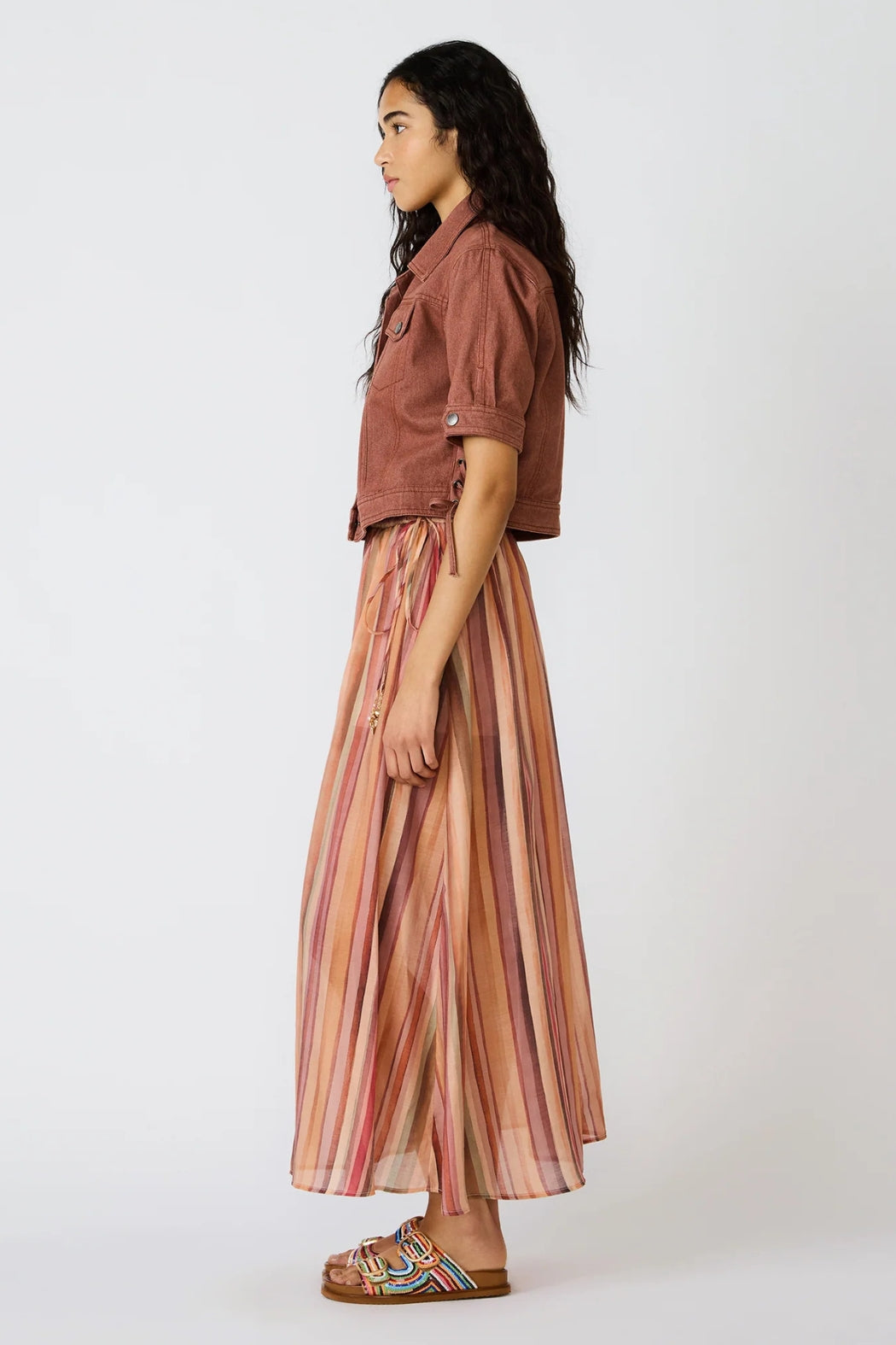 The Shilloh Skirt combines effortless elegance with contemporary flair. This maxi skirt features a graceful, flowing silhouette enhanced by vibrant multi-colored stripes that add visual interest and movement. The relaxed drape creates a flattering, comfortable fit perfect for both casual outings and elevated occasions. Versatile enough to pair with simple basics or statement tops, this piece transitions seamlessly from day to evening wear. An essential addition to any wardrobe seeking sophisticated style with modern appeal.