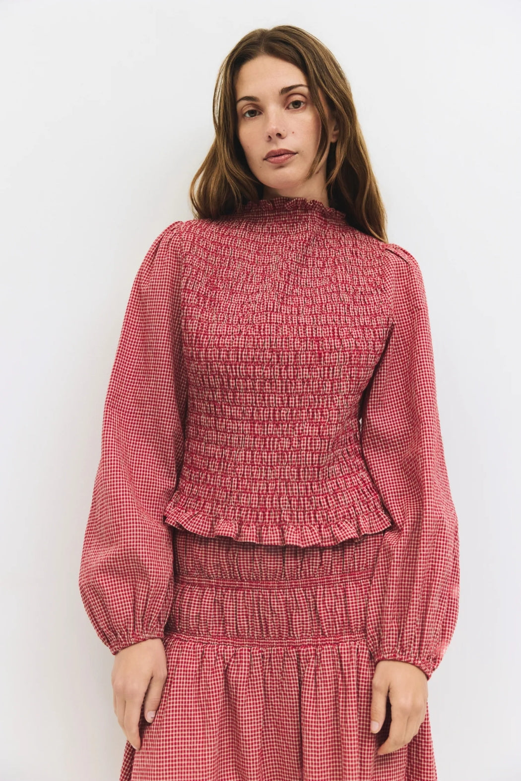 The Andrea Top is a lightweight gingham blouse featuring a smocked, fitted bodice and bishop long sleeves for a softly tailored silhouette. Finished with delicate ruffle details at the crewneck and bottom hem.