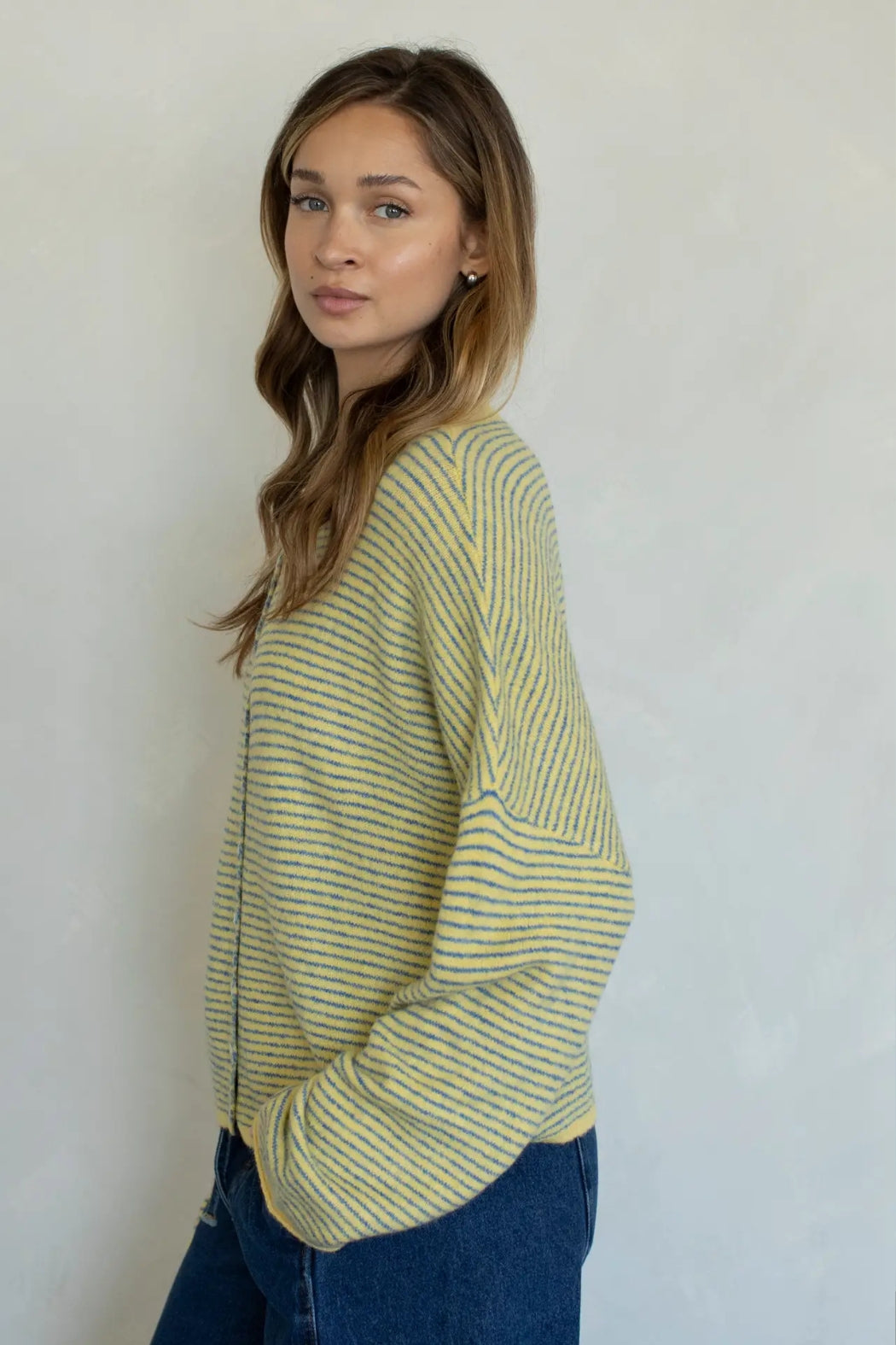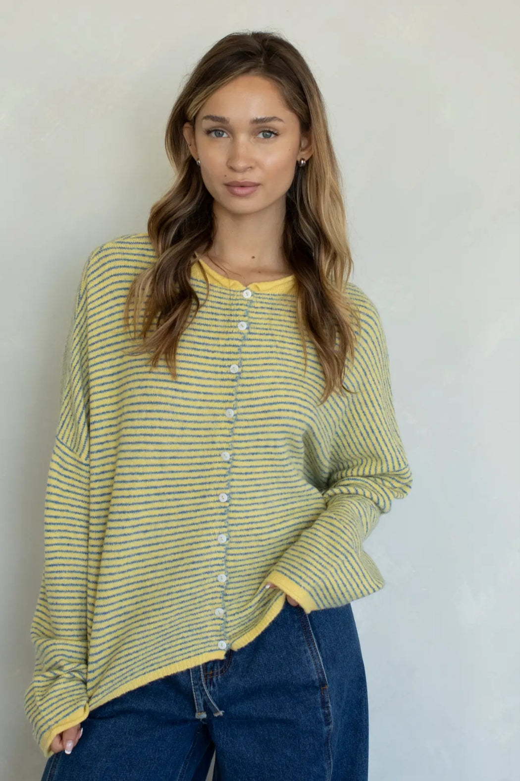 This cardigan is the perfect mix of cozy and lightweight. Oversized fit and slouchy design in pin stripes - lightweight and rolled edge finish on the sleeves and collar. Size down for a more fitted (but still slouchy!) fit- choose your regular size for an oversized look.