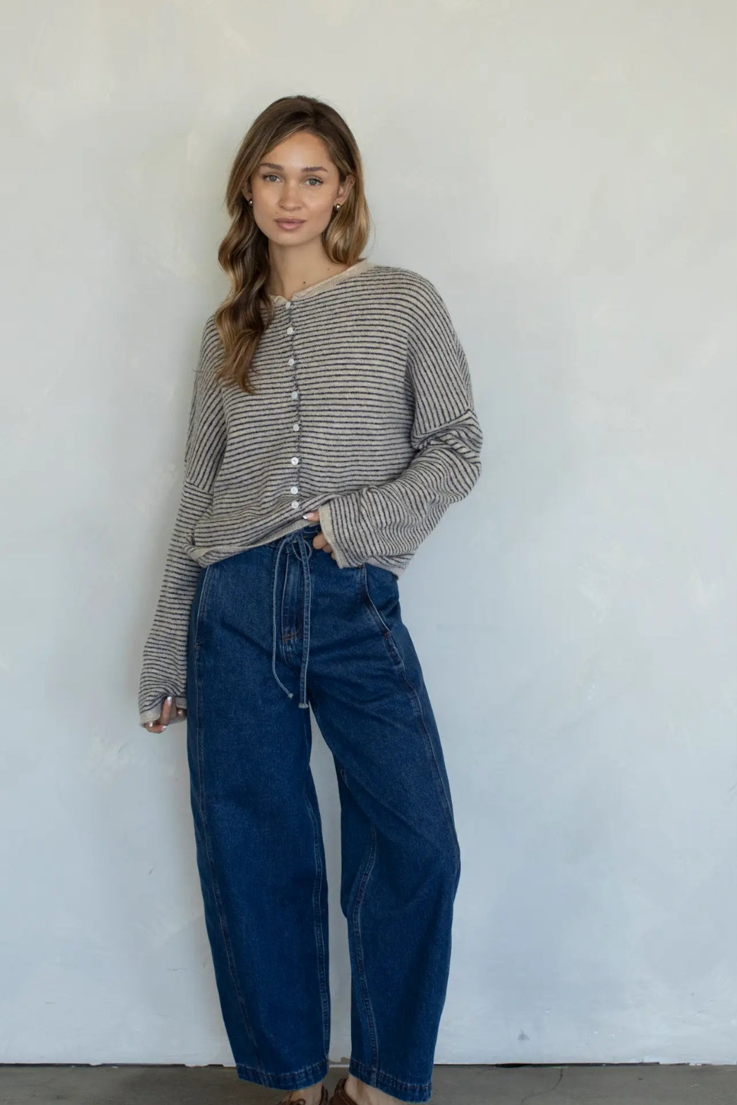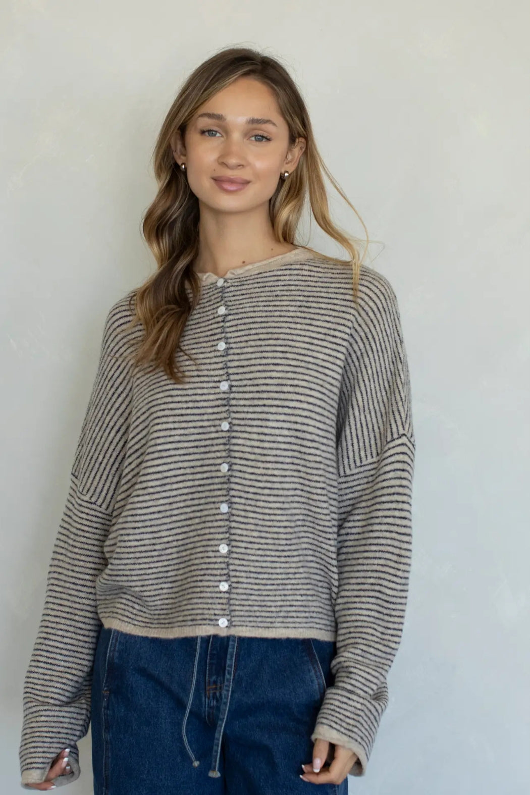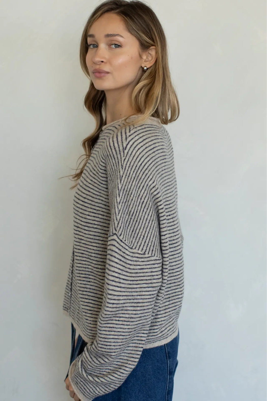 This cardigan is the perfect mix of cozy and lightweight. Oversized fit and slouchy design in pin stripes - lightweight and rolled edge finish on the sleeves and collar. Size down for a more fitted (but still slouchy!) fit- choose your regular size for an oversized look.