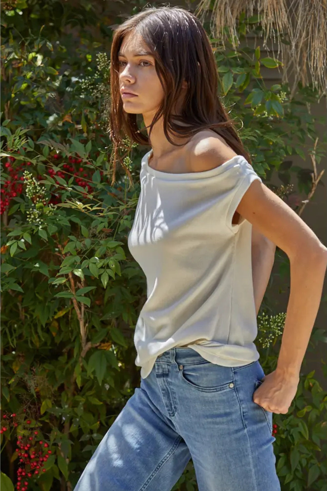 This minimalist, one-shoulder top is crafted from a soft blend of cotton, modal, and spandex. Its contemporary fit makes it a perfect choice for loungewear. This top is not only comfortable but also stylish. Add a touch of effortless luxury to your everyday wardrobe with this versatile piece.