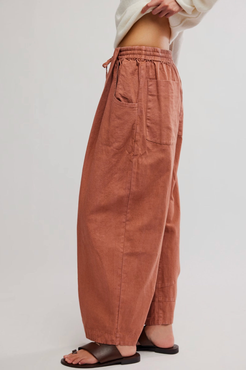 The definition of effortless, these easy pull-on pants are featured in a relaxed, low-slung style and breezy cotton-linen blend for any-season wear. They are mid-rise with front and back pockets. By Free People.