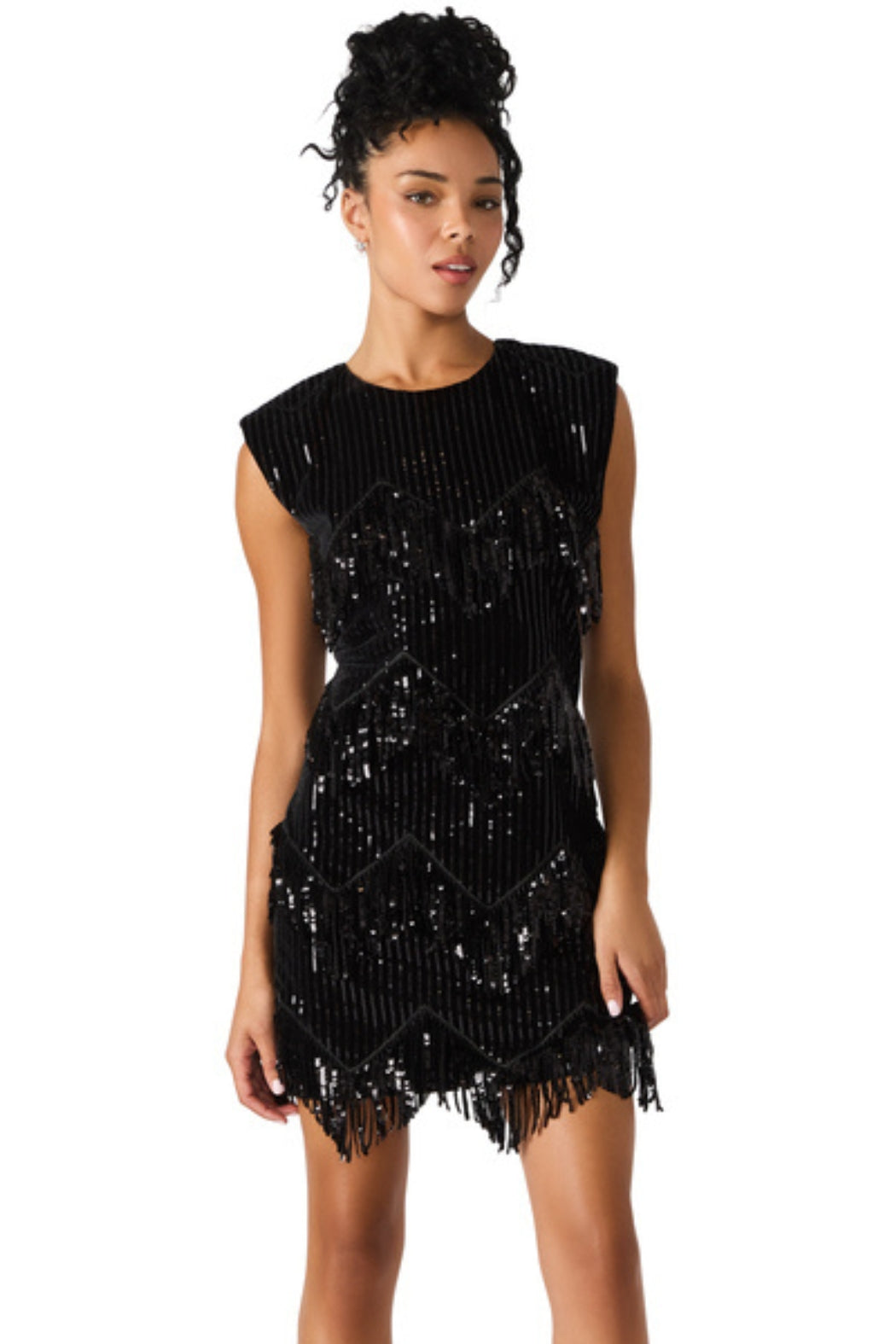 Get ready to shake and shimmy in the Astoria dress from Steve Madden! This fringed and sequined little black dress is a statement piece wherever you want to take it. Prepared to be the life of the party!