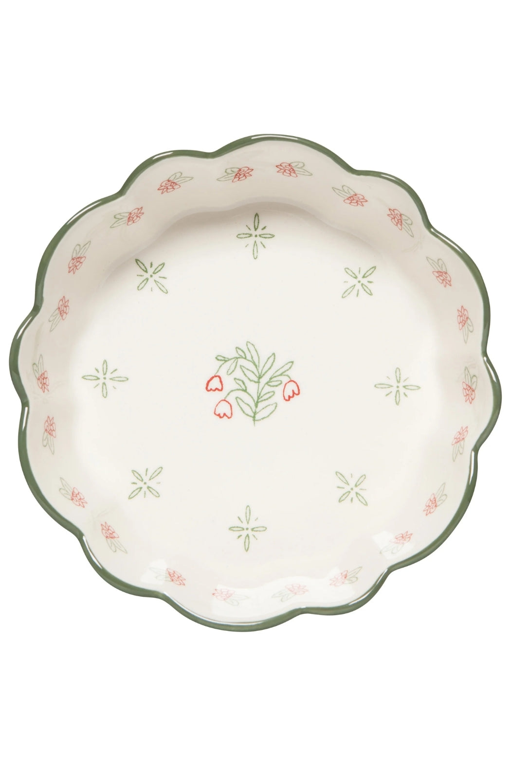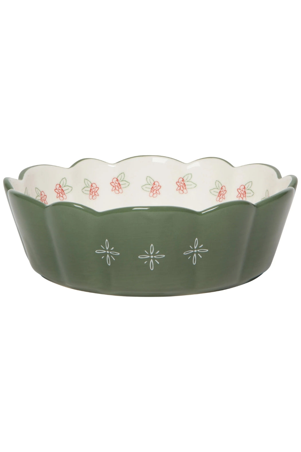 Delicate flowers in a quaint palette of sage green, wine red and bright white exude rustic farmhouse charm with this Camellia Stamped large bowl.