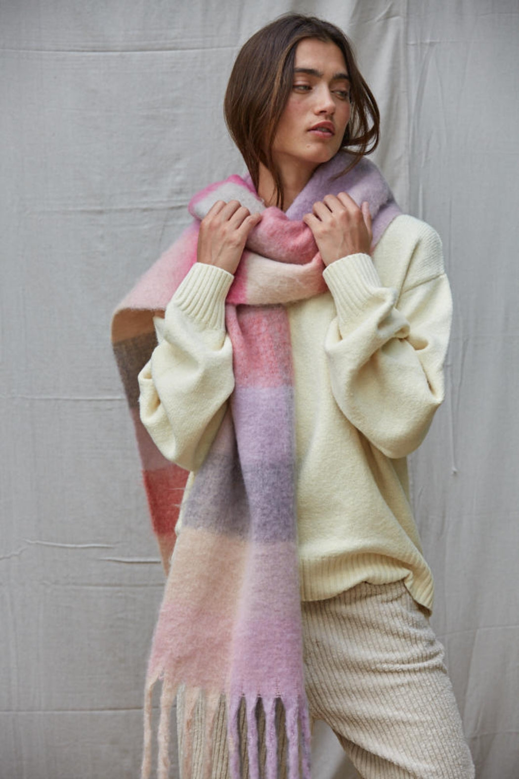 Enjoy a chilly outing with this warm gingham knit scarf with fringe detail. A bold piece that matches any outfits you have in mind.