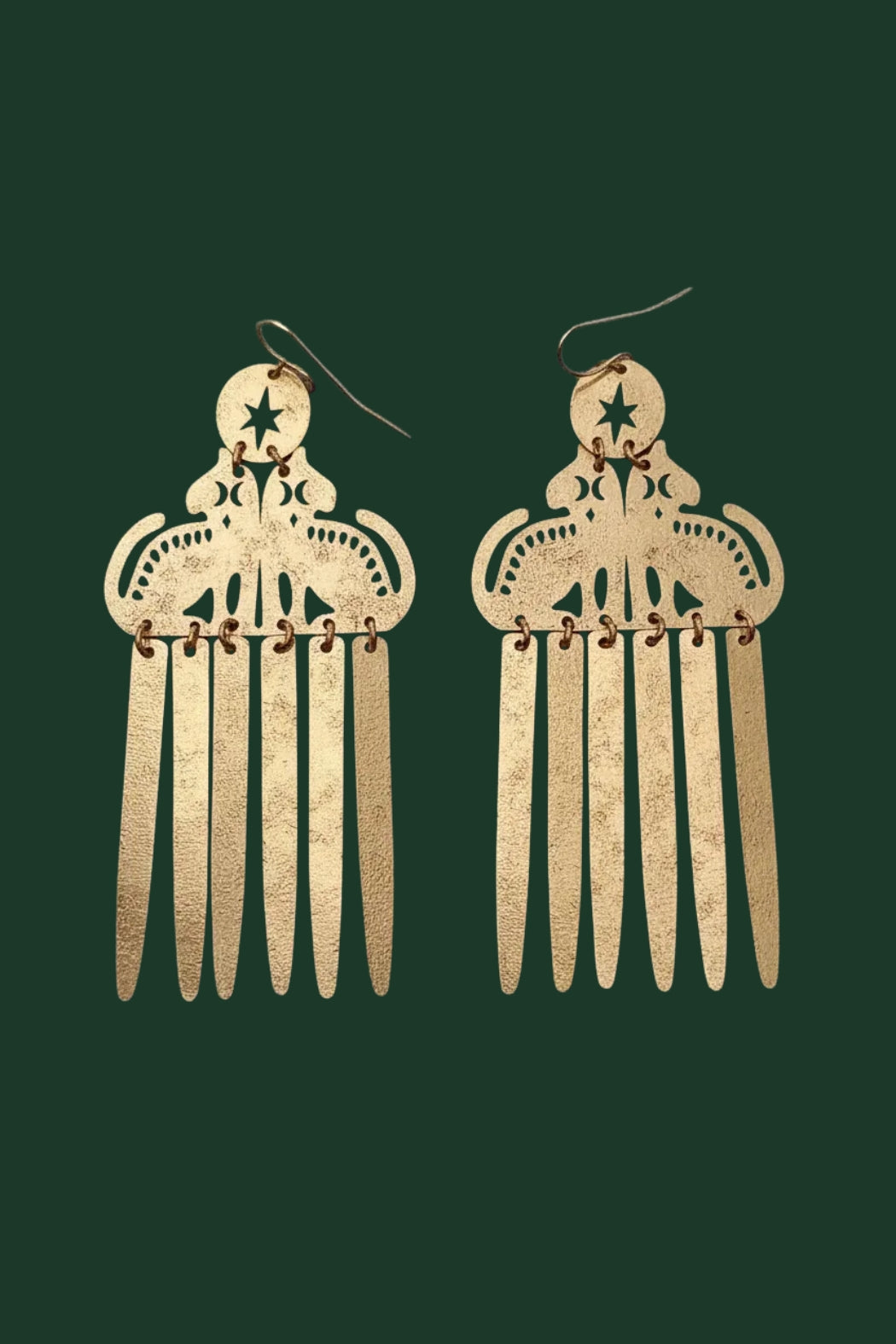 The Falling Felines Earrings feature two felines resting above a cascade of moving brass strips. The vertical elements sway freely, creating a sense of rain, flow, and continuous movement.