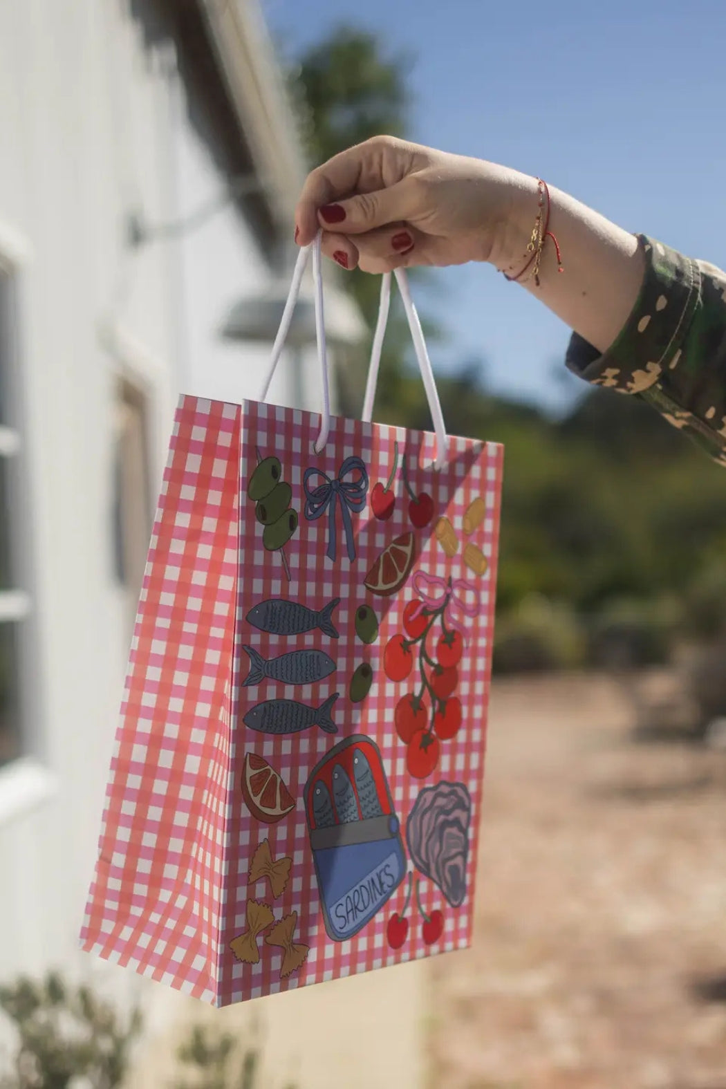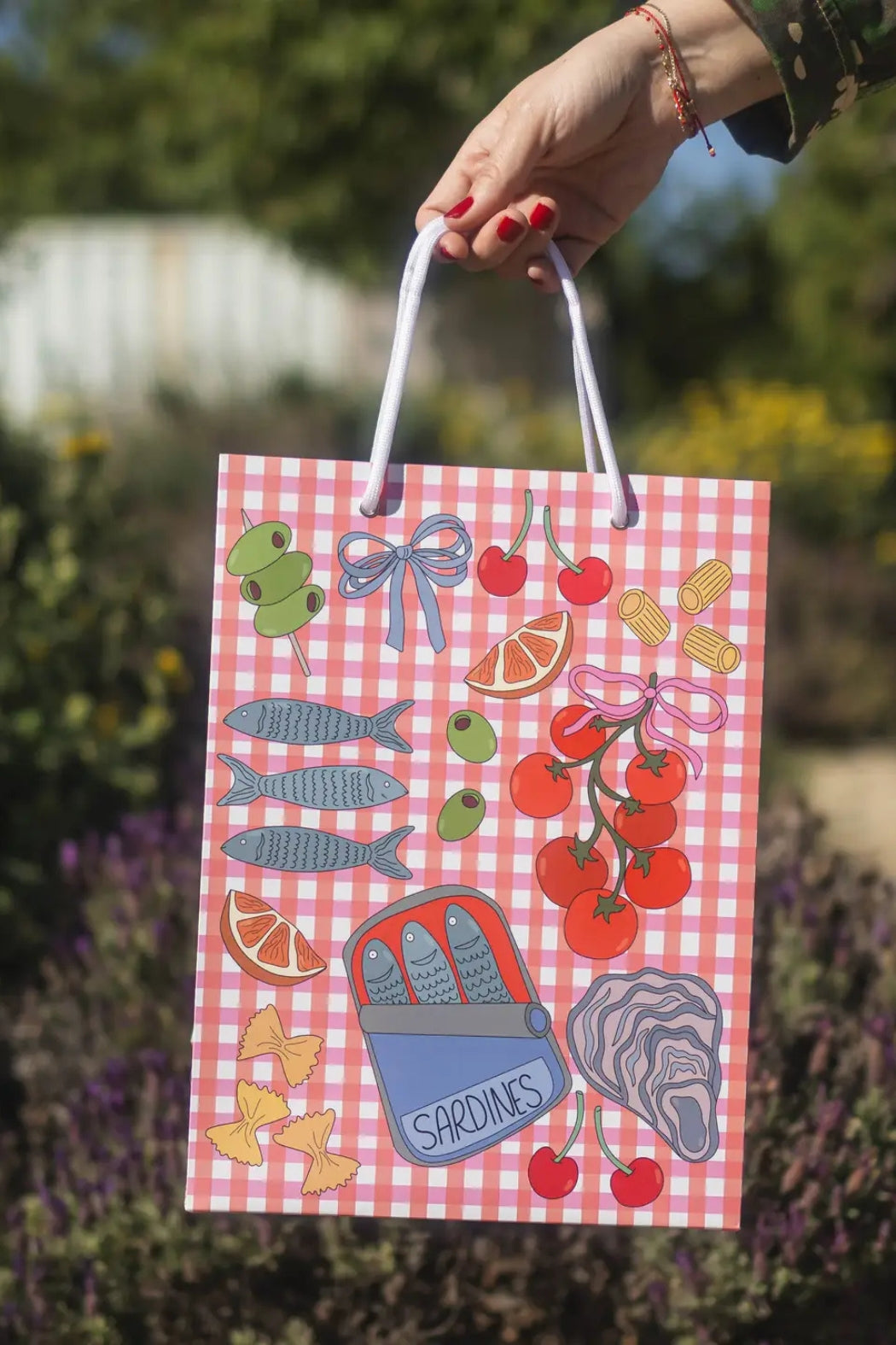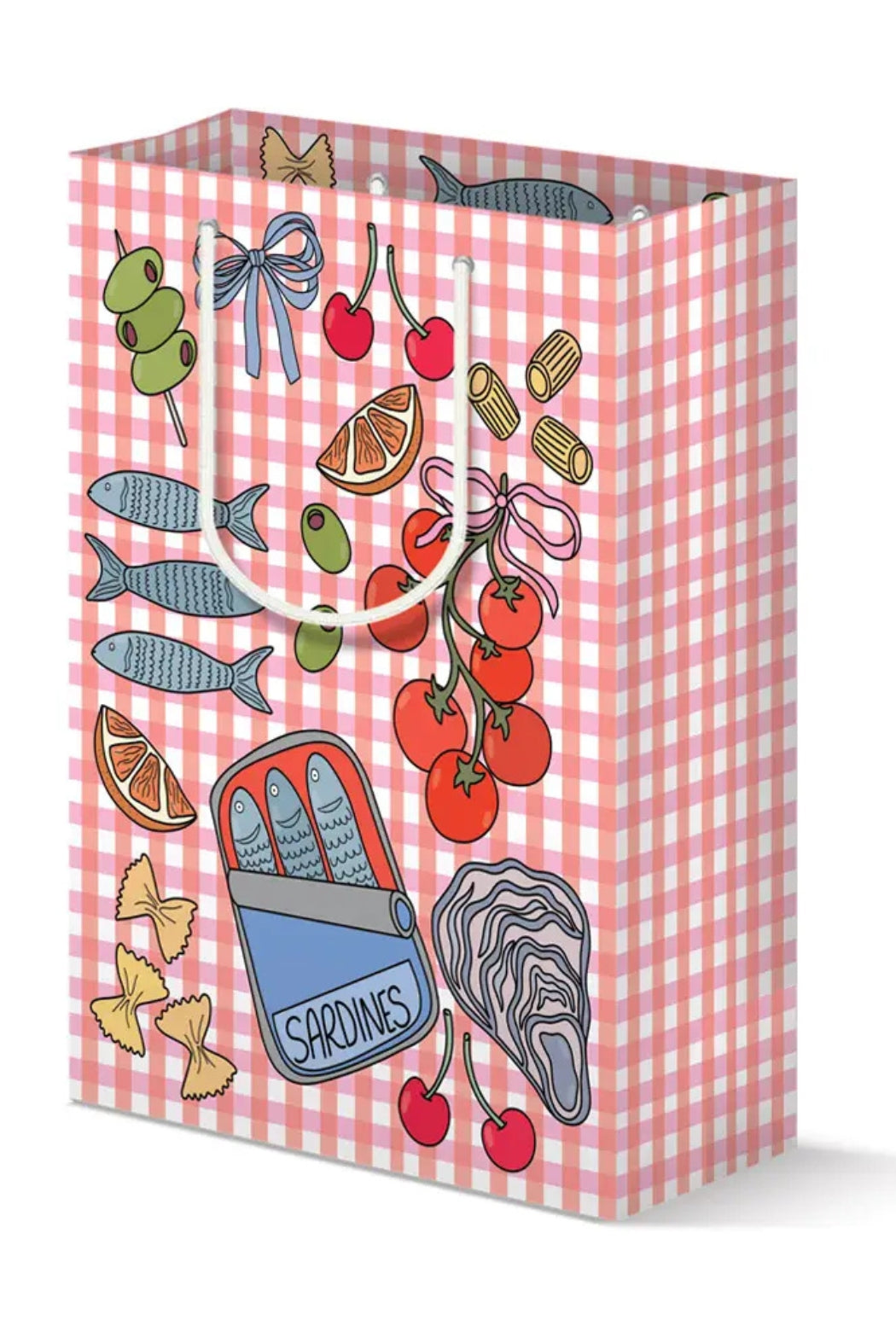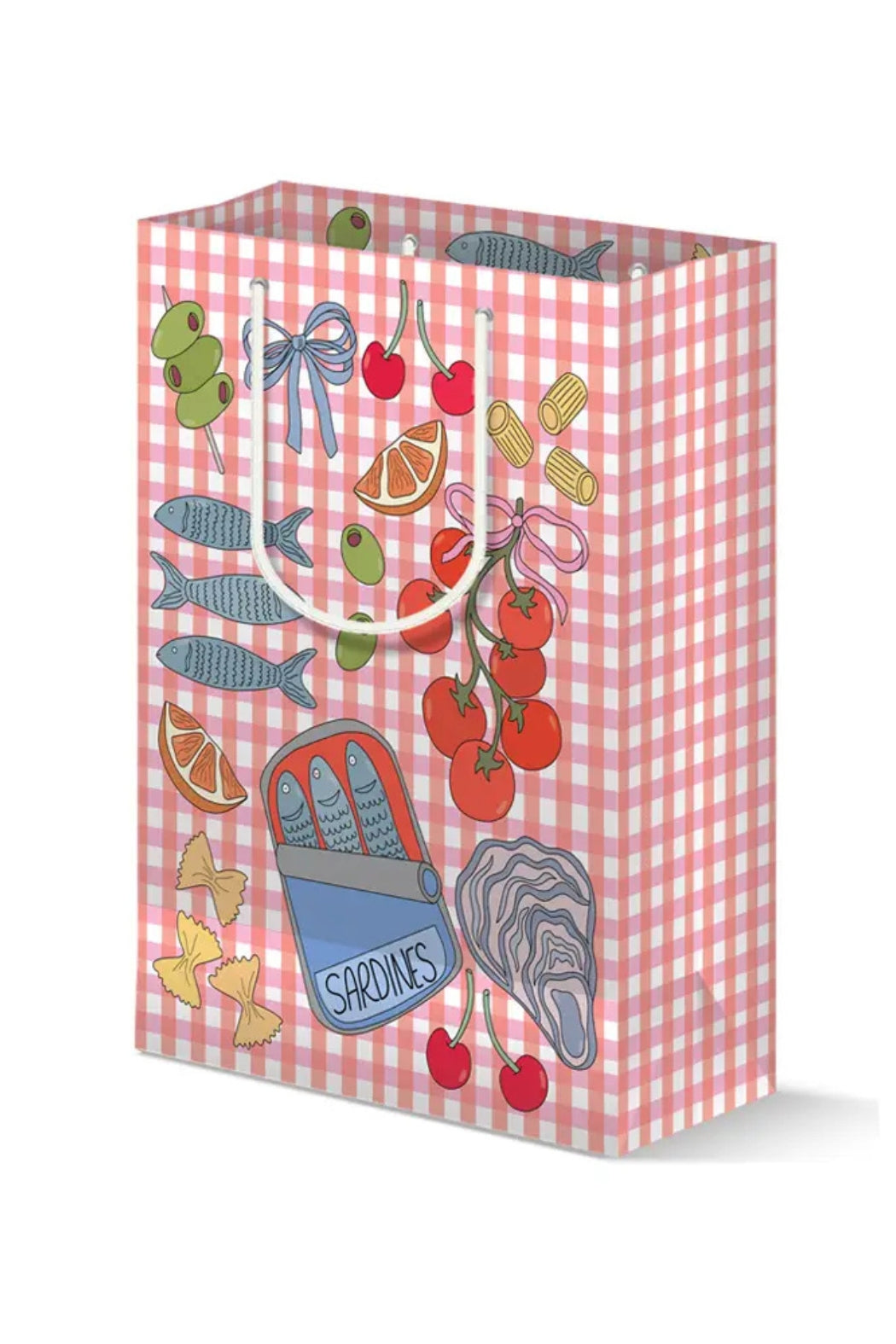 Bring a little Mediterranean charm to gift giving with this illustrated gift bag featuring sardines, cherries, tomatoes, pasta, olives, and bows on a pink gingham background. Inspired by Italian markets and summer picnics, this playful design is perfect for birthdays, hostess gifts, and special occasions. A cheerful, food-lover-friendly design that adds instant personality to any gift.