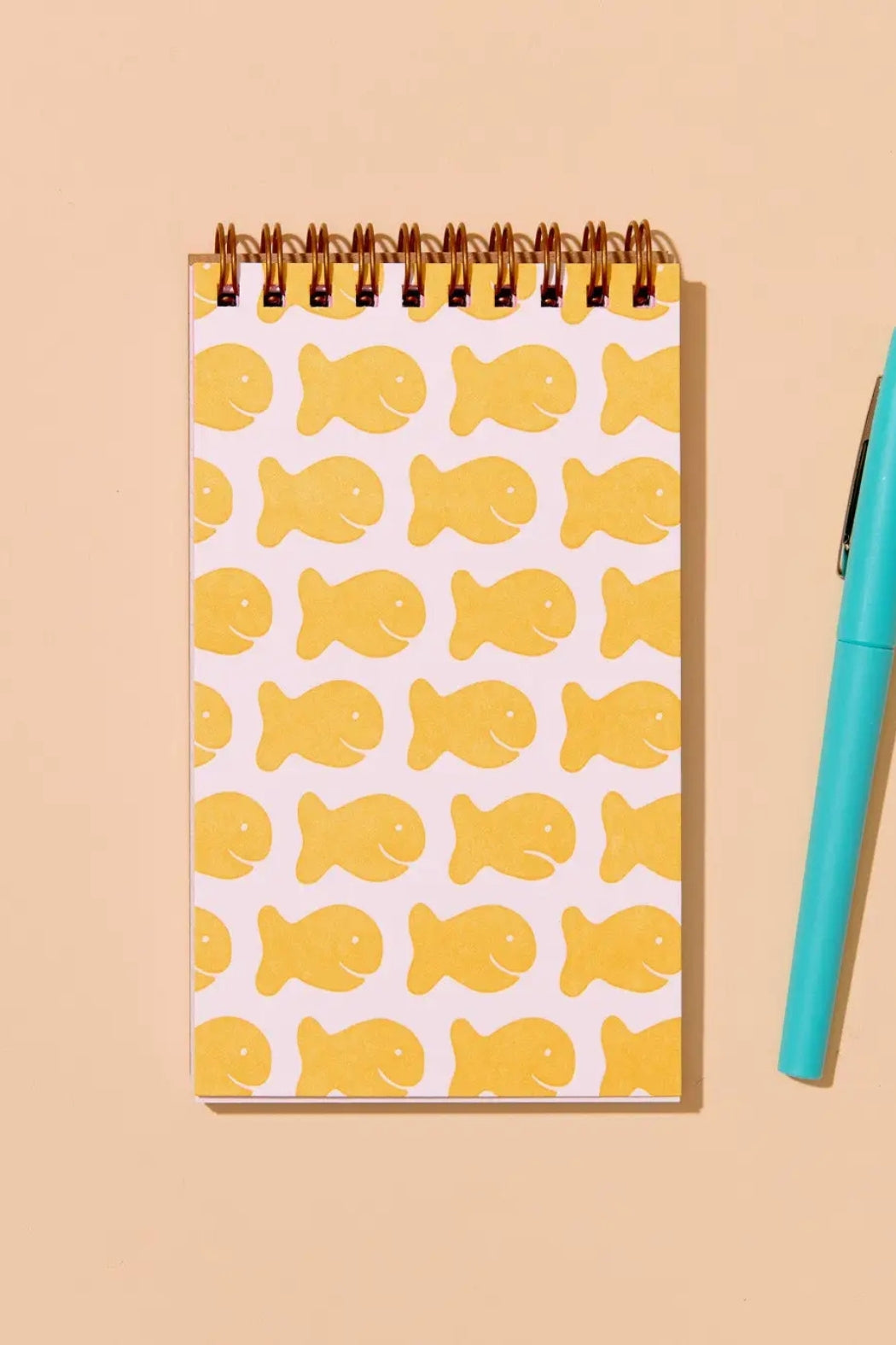 This best-selling little letterpress spiral notebook is a perfect, portable pocket-size size for everyday notes and lists, hand printed with a classic childhood icon... goldfish crackers! Perfect for everyday notes, lists, or as a gift! By And Here We Are.