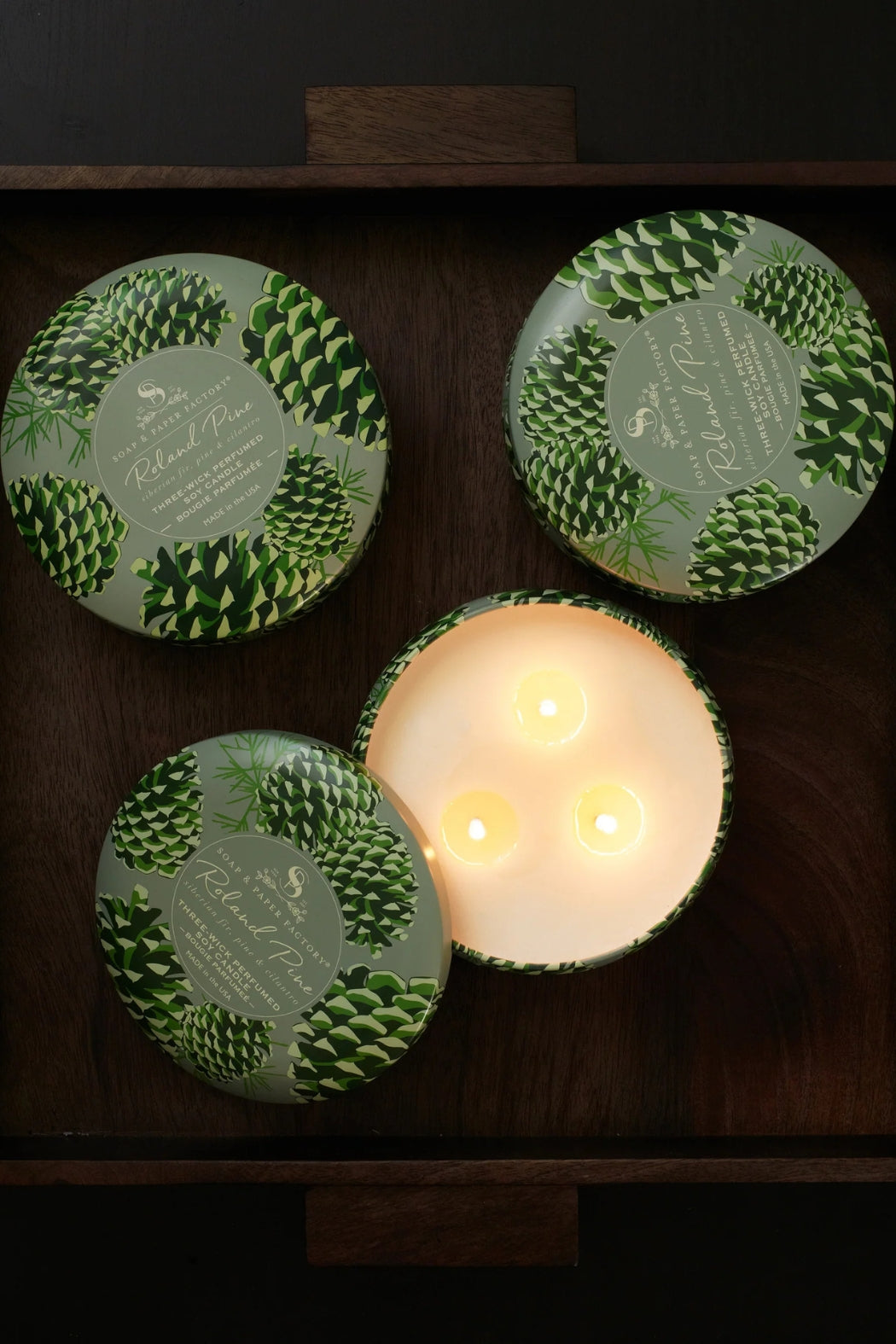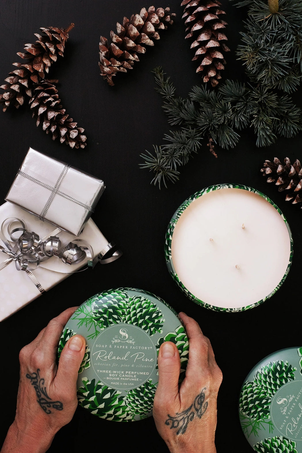 The Soap & Paper Factory Roland Pine Three-Wick Tin Soy Candle 13oz.