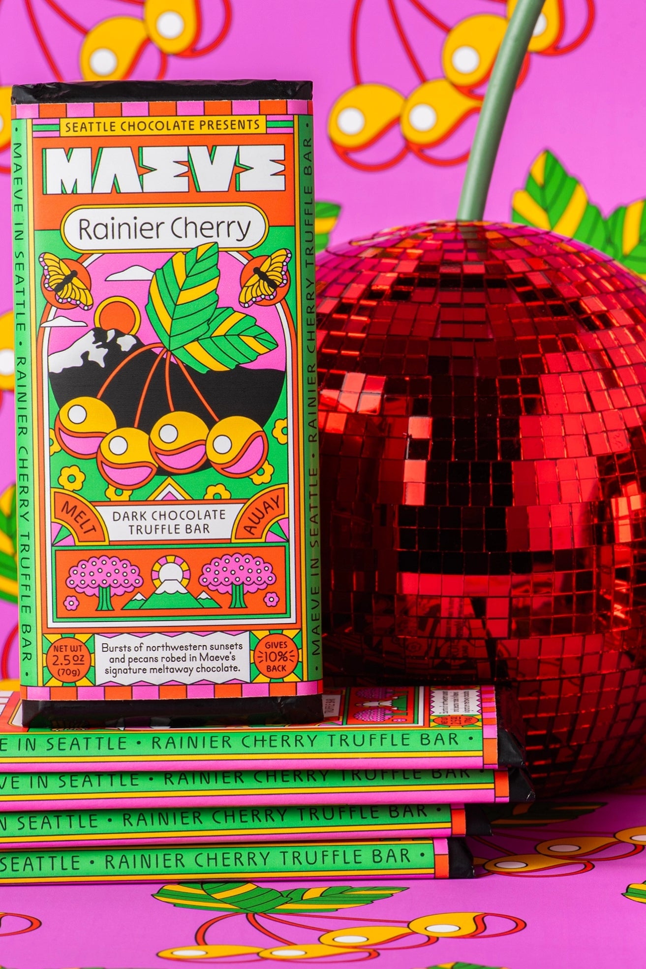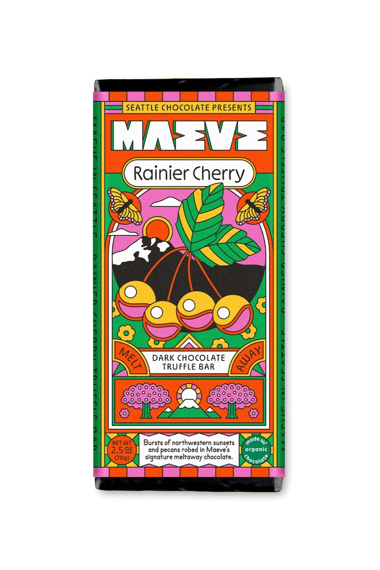 An iconic cherry and an iconic mountain come together in one of the most iconic chocolate bars. Maeve's Rainier Cherry bar features fresh dried cherries and pecans praline lovingly layered in between dark chocolate.