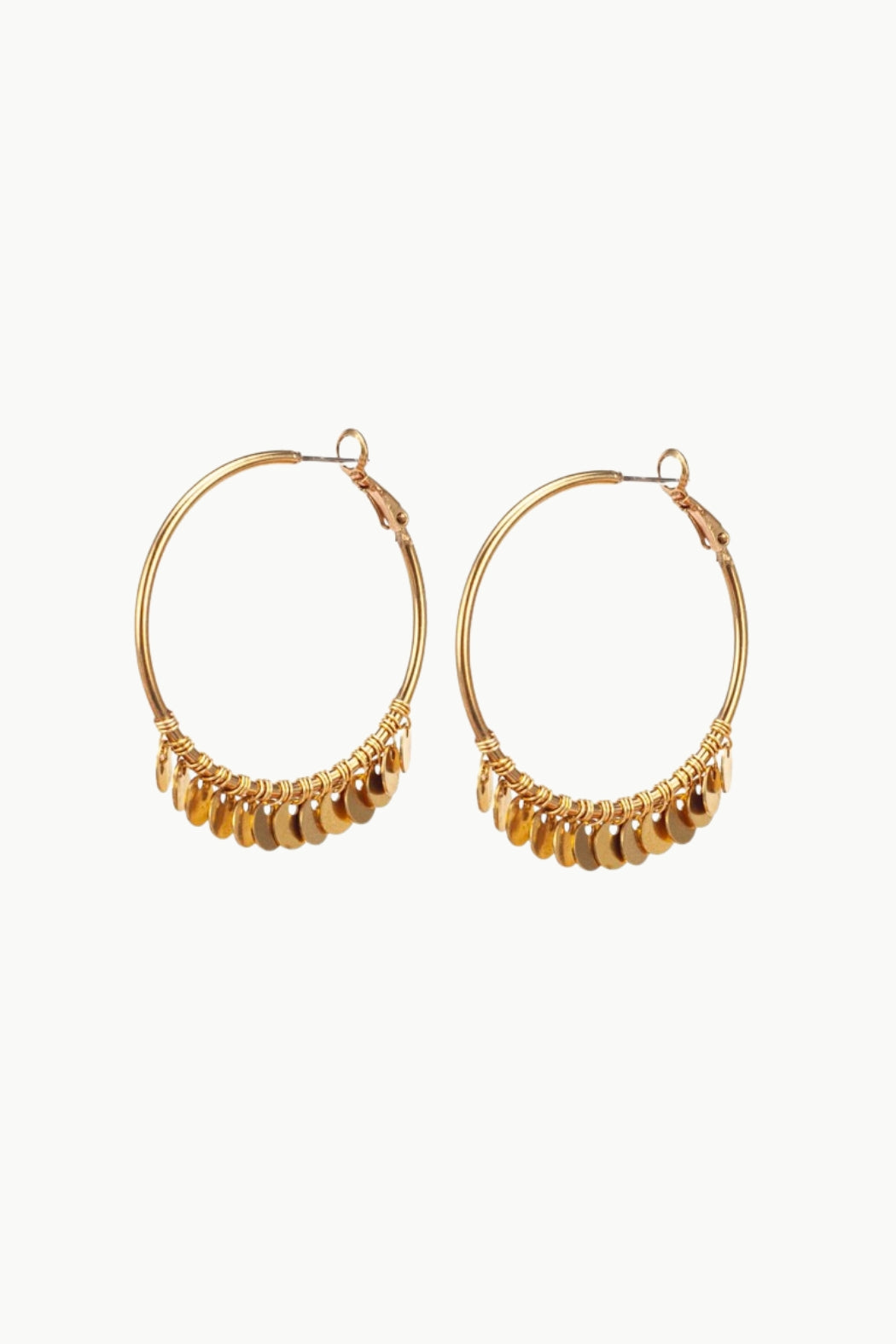 We are obsessed with the Disc Dangle Hoop Earrings! Circular brass discs hang off of these sturdy hoops, giving movement and interest.