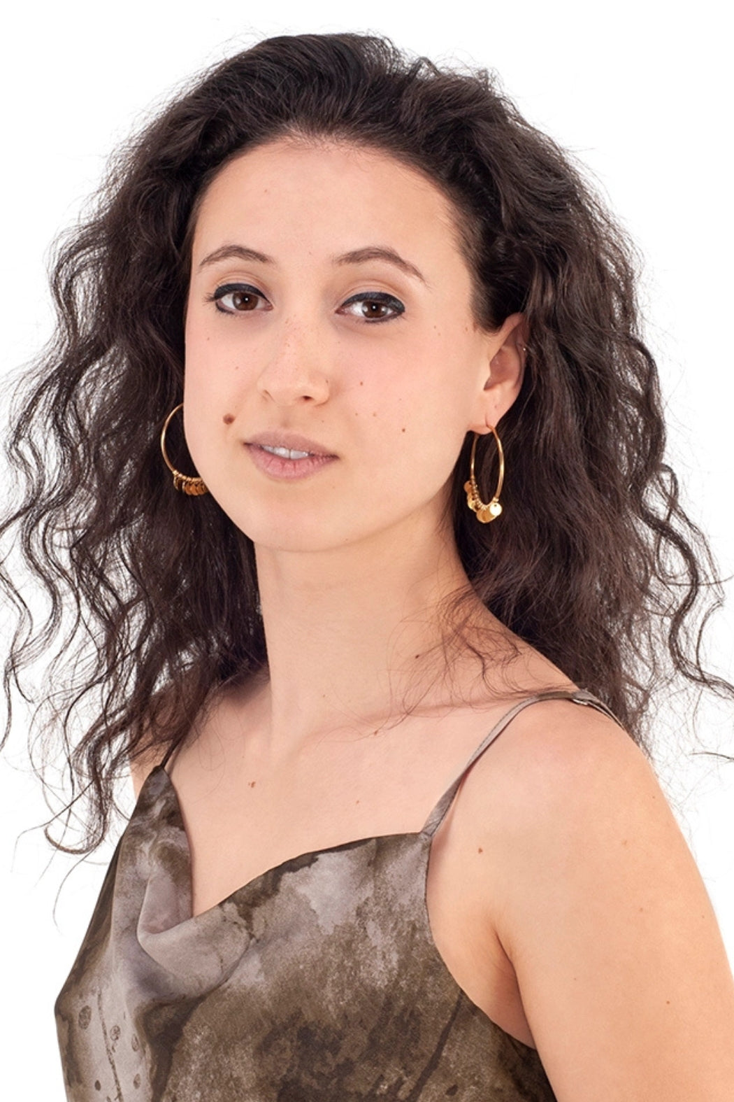 Sturdy lever back hoop with small brass circle dangles. 1.75" L x 1.5" W.