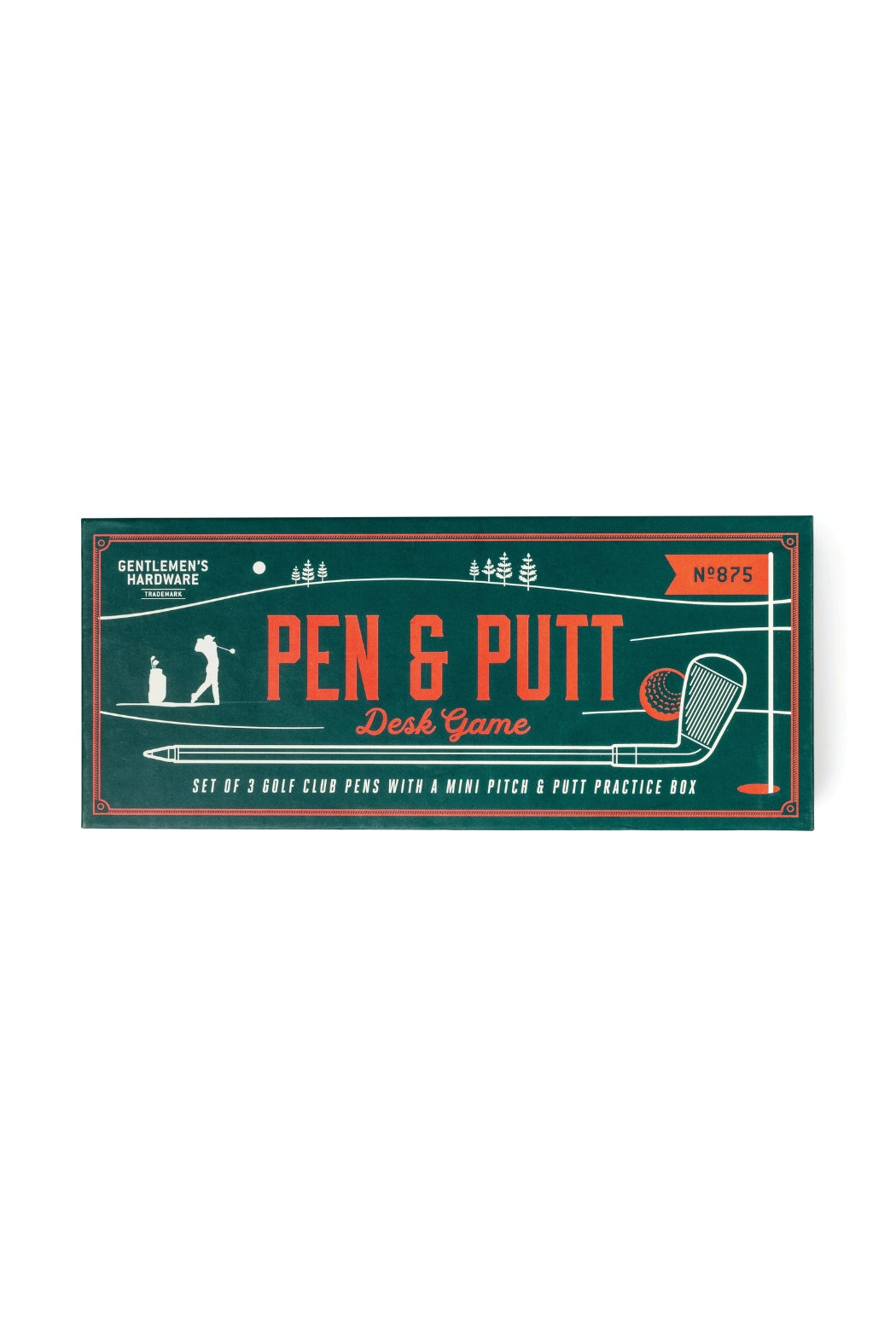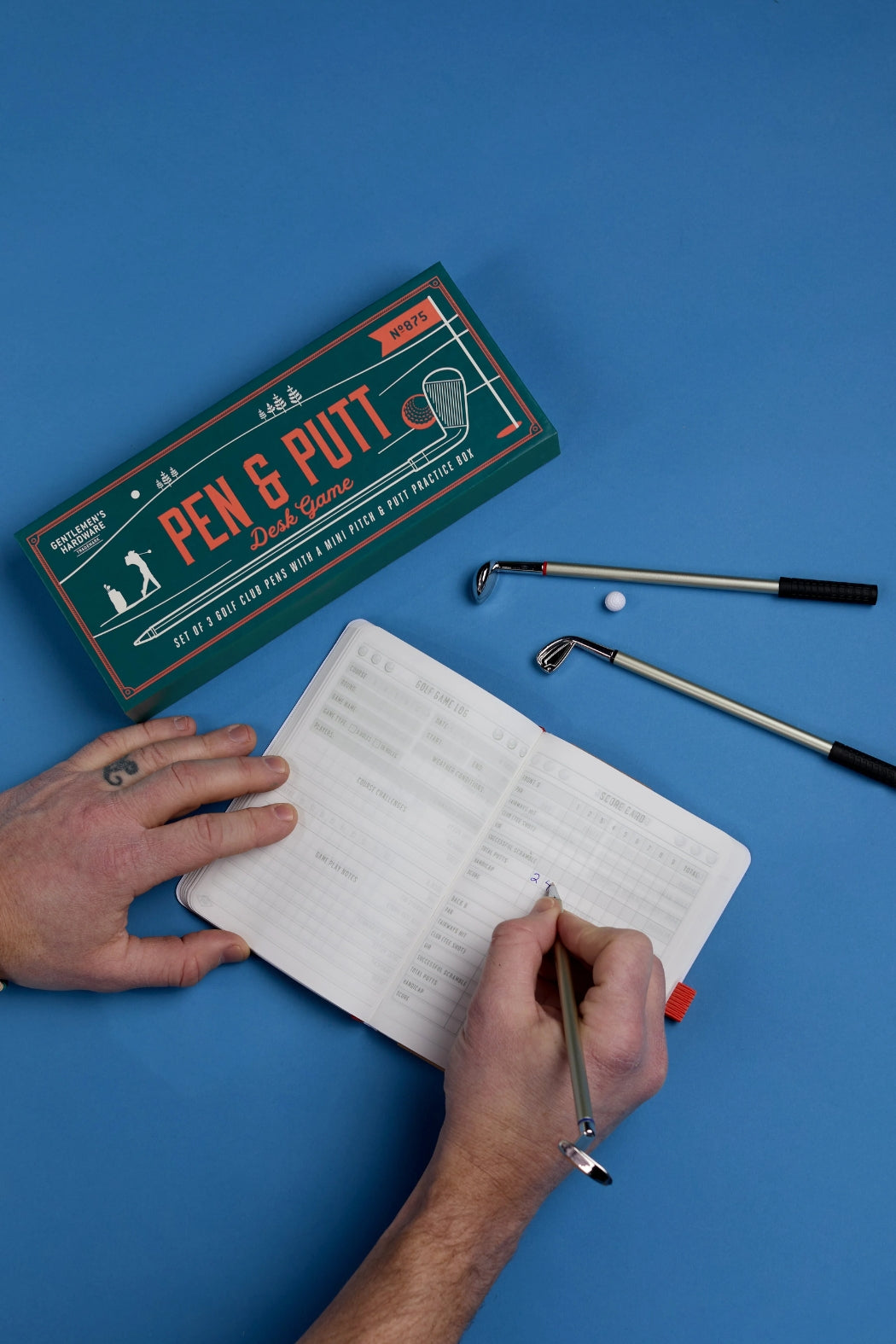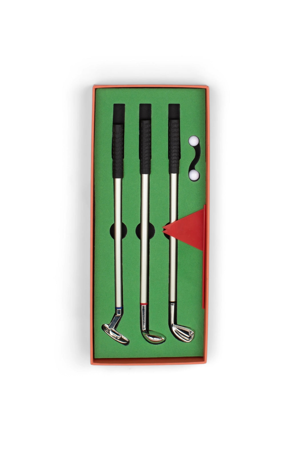 Practice your putting skills with the Pen & Putt Desk Game. This elegant desk set comes with a set of 3 Golf Club Pens with blue, black and red ink, and inside the box is a mini Pitch and Putt practice green, complete with flagstick and 2 mini golf balls. By Gentlemen's Hardware.